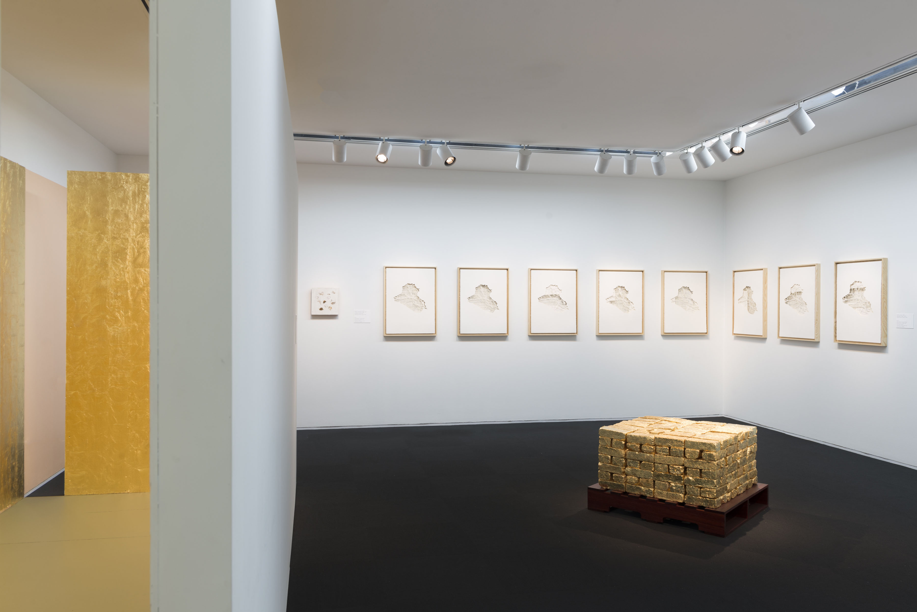 Gold is alluringly portrayed in several ways throughout the exhibition—positioned in the center like an open treasure chest or glimmering from behind a corner, just out of reach. The accompanying text acknowledges the value of this color, describing “material values and abstract notions of success” as well as ideas of “gaudiness and excess.” However, after having attended several of Williams’ lectures, it seems like the gold used in her work can mean so much more. A piece like It’s a Gold Mine/Is the Gold Mine? feels so much richer for the urban context from which its material was drawn (the bricks of demolished Chicago houses). But a site-specific piece built for the museum setting, like the gold-drenched room called A Dream or Substance, a Beamer, a Necklace or Freedom? looks contrived—so much so that it seems a little less brilliant under the pale-blue lighting of the awkward room surrounding it. Presented in the level field of the gallery, the two gold-covered pieces read as equally valuable, with the salvaged brick reduced to the same level of meaning as the new drywall.