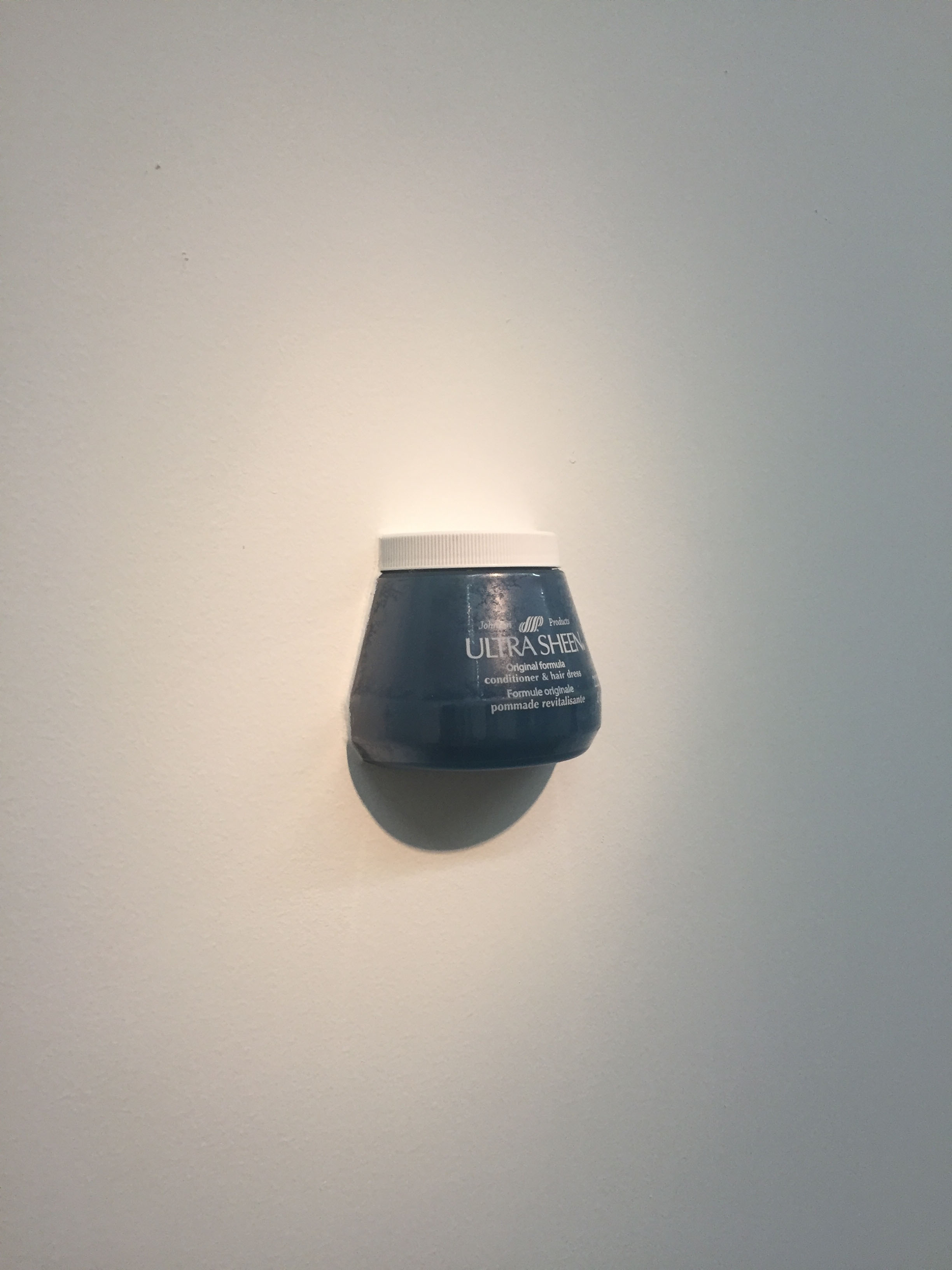 To borrow Joseph Schumpeter’s term, the “creative destruction” that tears down one group in an effort to enrich another is as prevalent today as it was in the 1970s heyday of UltraSheen.11 White women borrow freely from black women—as seen in the casual appropriation of “ratchet culture” and cornrows—but the opposite is almost unthinkable. hooks again clues us into the heritage of white female appropriation of black female aesthetics. The relationship between black women and white women, according to hooks, is rooted in the hierarchy of slavery. A mutually antagonistic relationship emerges, in which both groups feel envy and distrust for each other, though skin color privileges white women. As a result, casual appropriation of black beauty allows white women to don the aesthetic of black women without having to live the realities.12 It follows then that Williams’ beauty product pieces particularly speak to black women. UltraSheen is a product for black women that white women cannot appropriate because they will never have an experience of the reality of black hair. When Williams presses an UltraSheen jar into a wall, she is elevating a product created by black entrepreneurs for an exclusively black market to the status of a work of art.13
