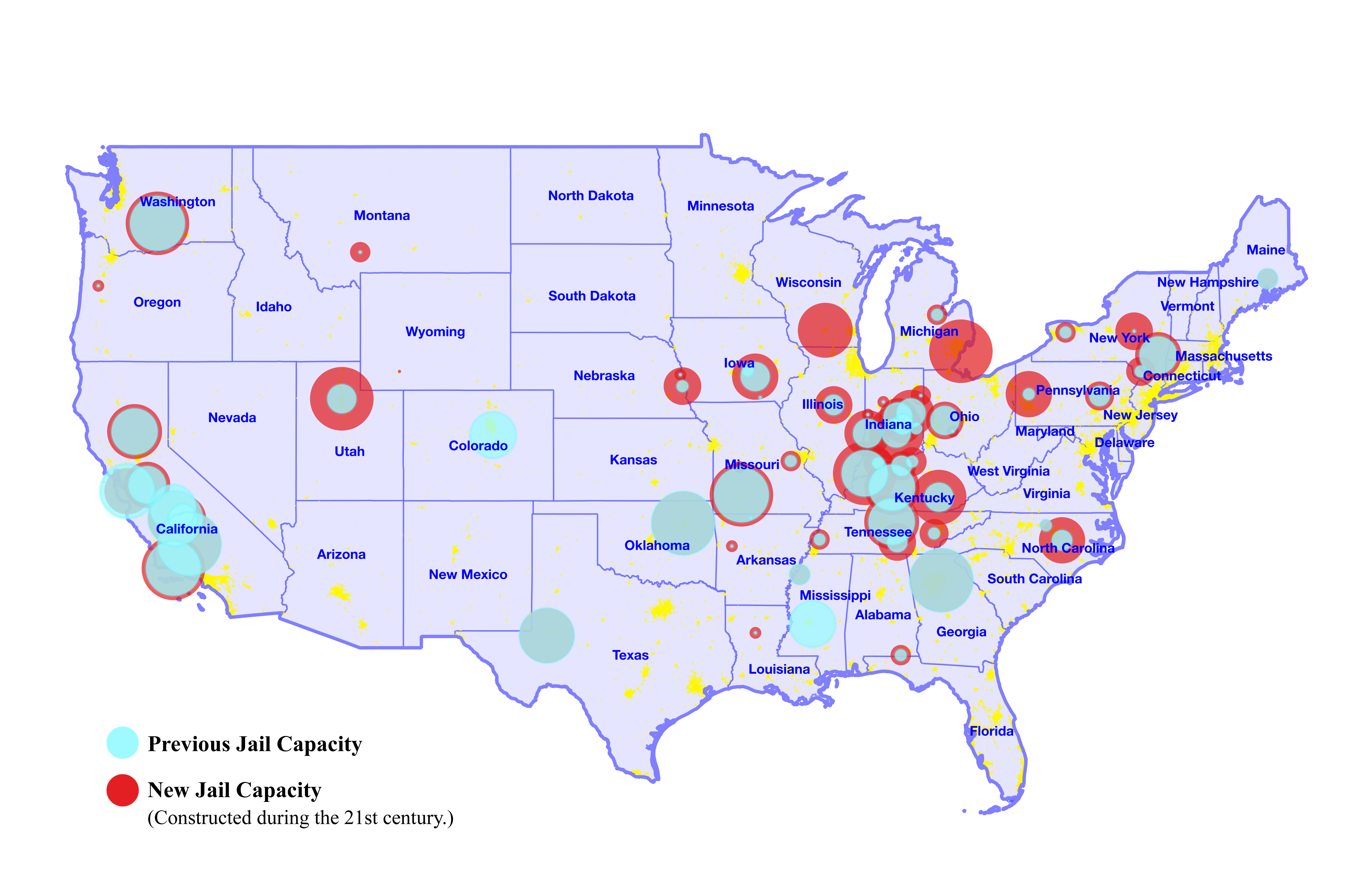 To unpack what the new “borough-based jails” typology means for the future of incarceration, a shift in exploratory scale is required to acknowledge the carceral condition across the United States. Pulling back to oversee the broader context, a clear urban/rural dichotomy is revealed. Carceral institutions are liquefying in the urban sphere, trading in the rigidity of cement walls and “out-of-sight” locations for glass skyscrapers that neatly fold into the city’s urban fabric. Simultaneously, these infrastructures are heavily solidifying in rural contexts, rendered visible by an ongoing and sharp increase in nonurban jail construction and detainment capacities.