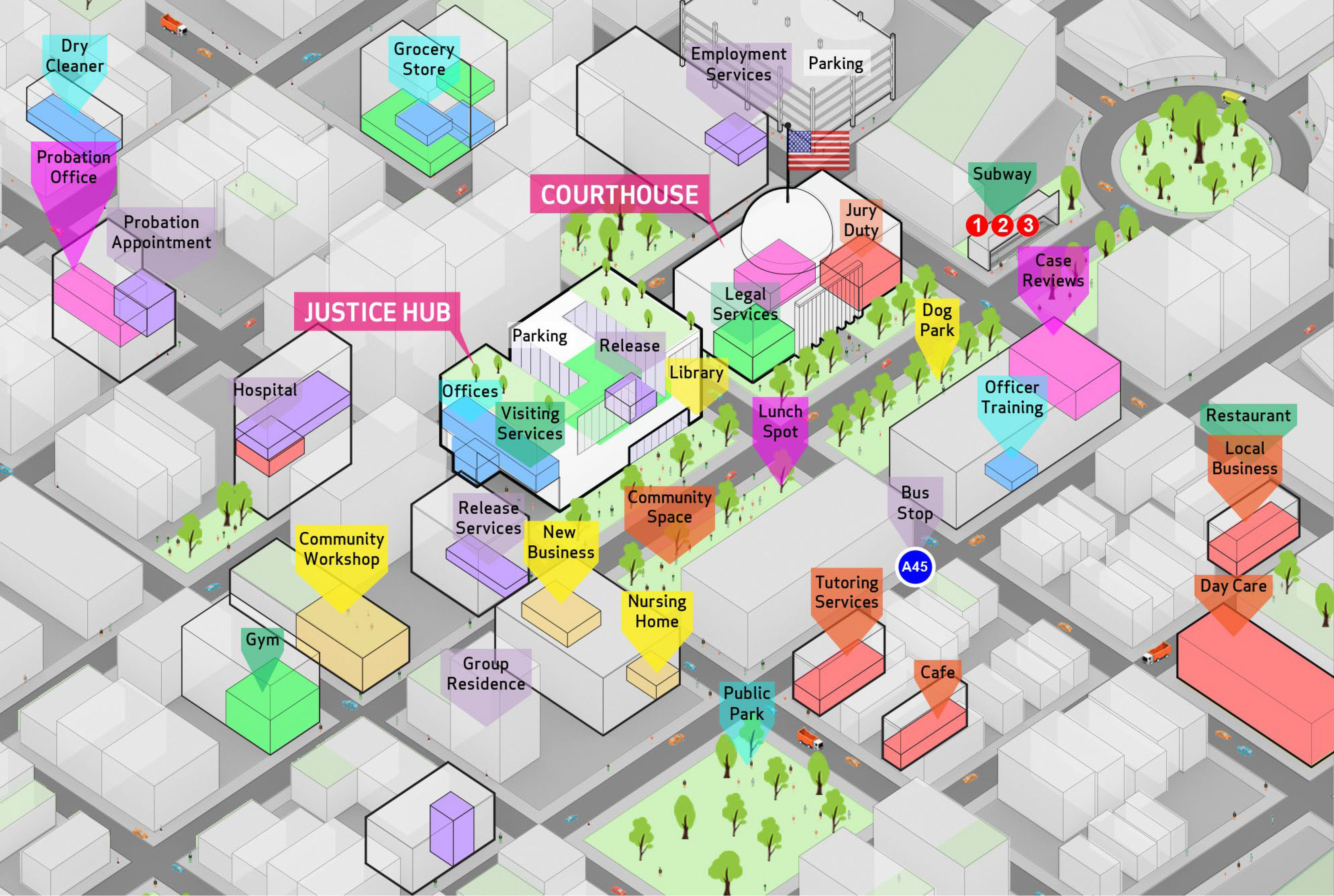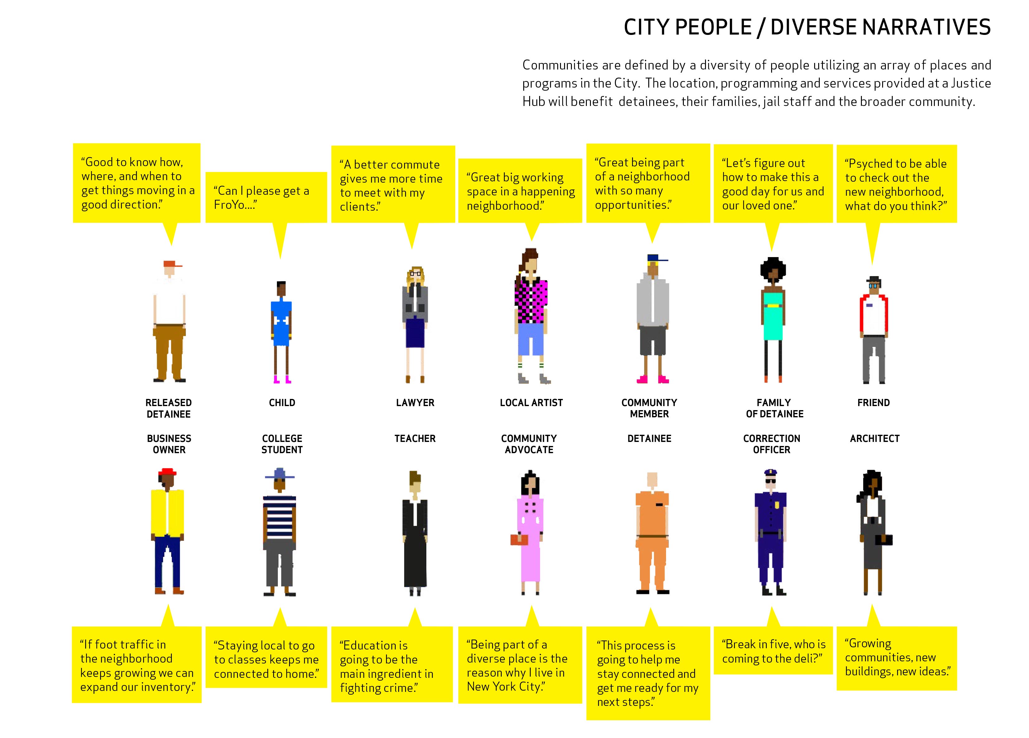 As part of reform’s magic, the urgency of abolishing the Carceral Industrial Complex continues to be deliberately obfuscated by visualizations produced for political convenience, depicting new and “reformed” jails as “humane” institutions. Responding to a request from the Lippman Commission to develop “healthier and more rehabilitative jail infrastructure,” the Van Alen Institute published a report called Justice in Design in 2017.20 The report proposes “justice hubs”—an interpretation of the rebranded “borough-based jail” model based on a series of workshops with groups directly affected by incarceration, seamlessly flowing in and out of surrounding community infrastructures. Presenting “bettered” systems in a graphically “approachable” manner, as James Kilgore reminds, merely continues to “rearrange the relationship of things and of people” and exposes the application of these typologies as modes of “cosmetic reform in order to avoid systemic restructuring.”21 The polemics behind Justice in Design’s diagrams, a collection of generalized and vague massings produced by architecture firm NADAA, were critically assessed during a conversation between Jarrod Shanahan, Zhandarka Kurti, and Brinley Froelich, published by Verso on March 13, 2020: