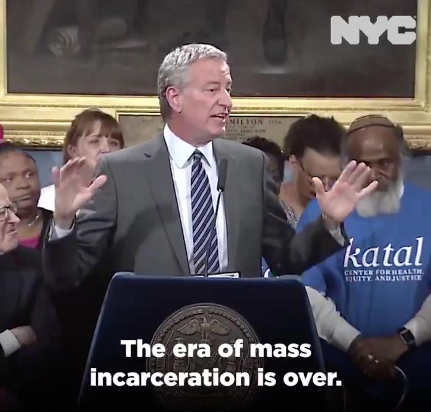 On October 17, 2019, New York City’s Mayor Bill de Blasio announced, “Today we made history: The era of mass incarceration is over. It’s over.”2 This statement, made at New York City Hall, came after the City Council approved De Blasio’s plan to replace Rikers Island Correctional Facility (Rikers), the 415-acre jail island located between the Bronx and Queens, with four new “borough-based jails” by 2026. In the clip, posted on the mayor’s Twitter profile, De Blasio stands tall at a blue velvet-draped podium bearing the New York City seal. De Blasio sports a suit. He is backed by a gold-framed portrait of Alexander Hamilton and an “entourage” of six individuals, four of whom are Black. The individual to his left wears a blue shirt with white lettering that reads “Katal: Center for Health, Equity, and Justice.”
