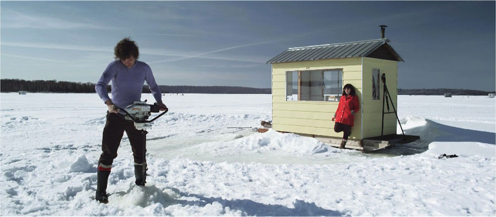The symbiosis between cinema and architecture is oft commented on; one could mention many an operative mise-en-scène.1516 Within Canadian borders, one might revisit Michel Brault and Pierre Perrault's black-and-white docu-fiction film Pour la suite du monde (1963), about the life of fishermen on L'Isle aux Coudres in Quebec. Canadians often fish for tommy-cod on frozen lakes, boring a hole with an auger and building a small cabin. Such ephemeral ice fishing villages, built on frozen stretches of water, form fascinating nomadic settlements. On this subject is the stunning short film made by Éric Morin, Opasatica (2010): Against a background of ice fishing on the eponymous lake in the James Bay region, a Spanish woman has a brief, intense affair with an outfitter in an atmosphere dominated by cold, imbued with the odors of gasoline and fish. The action is situated in a cabin, a secluded spot in an infinite space, and draws an extreme contrast between an enclosed intimacy and a vast extimacy.17