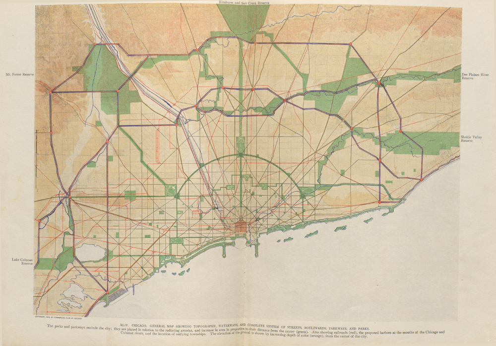 This is the same Chicago Plan Commission that was formed in tandem with the publication of Burnham and Bennett’s Plan of Chicago of 1909. Then-mayor Fred Busse appointed 328 men, representing the city’s business and social interests, to promote The Plan’s vision and implementation. From one city to forty-four in thirty-three years: “Make no little plans” had become “Make a whole lot of little cities.”