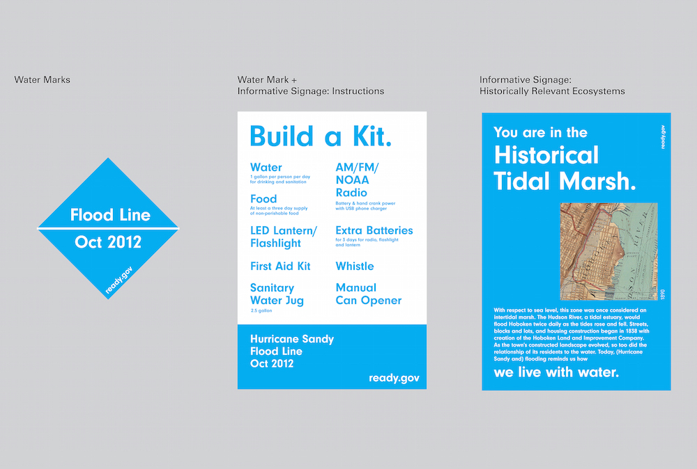 Initiated by the Rockefeller Foundation in coordination with municipal and national initiatives, RBD has brought together architects, urbanists, engineers, marine ecologists, climate scientists, and economists to propose a new approach to design in the age of extreme weather. The projects assembled by RBD unanimously eschew any radical transformations to the physical spaces of Greater New York City. And while they tend toward regional plans, the strategies of RBD actually operate at a much finer grain. Appearing to promote agency rather than heavy-handed design, what the projects seem to consist in are largely “reclaimed” spaces at the interface of land and water, appropriated by the bodies who inhabit them—shoppers at a local market, families playing on docks, tai chi under the freeway—all of which seem to accentuate the everyday behaviors of individuals. We find urbanism takes on a pedagogical capacity: citizens are now constantly informed about the risks of flood and the local histories of climate catastrophe within the city. Signs, placards, and public institutions distributed throughout the city serve as signposts for a new cult of crisis to establish itself in the metropolitan consciousness. The spaces of RBD are evidently “smart” spaces, with cybernetic technologies coordinating a new sense of public exchange: Citi Bike stands couple real-time hurricane and flood information with public Wi-Fi hotspots and cellphone charging stations; news kiosks distribute “Flood Risk” flyers; and smartphones are equipped with flood-risk apps, all of which will assure the widespread integration of a new public knowledge of climate emergency and its spatio-social management. In fact, it was observed that the process of design itself should play an “essential role” in “educating the civic partners about issues related to resiliency.”9 These strategies, all made evident in renderings, drawings, and diagrams from RBD proposals, and further elaborated in their project descriptions, make the integration of smart city technologies more overt while at the same time departing from any familiar and childish infographics typical of smart city representations. In the final round of RBD, several of the winning proposals suggested that, through the use of distributed Internet and Communications Technology (ICT) infrastructures, new feedback loops of data relevant for government, first responders, insurance companies, and the general population could be created to streamline the management of emergency situations in both immediate (first responders)10 and long-term time scales (recalibration of risk by insurance companies).11