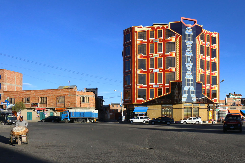 The lives of cholitas changed dramatically with the election of Evo Morales in 2006, along with their neighborhoods—usually vast, high-altitude slums, which are now slowly being fitted with better transportation and public services. The “Evo Era” brought a populist-socialist revolution to Bolivia led by the indigenous poor. Yet, it has also produced some unplanned and, perhaps unwanted, symbols of the newly empowered poor: a new, instantly recognizable residential typology for the emerging indigenous middle class. Perched high above informal urban settlements in La Paz and other Bolivian cities, these houses burst forth from their utilitarian environments in rococo Technicolor. Their most visible instance is in El Alto, the sprawling sister of La Paz, which began as an informal settlement but has since outgrown the capital, spreading upward into the hills in a jumble of half-finished homes and markets where plumbing supplies are sold for the ongoing construction boom. They have been dubbed cholets—the “chalets” of the cholitas.