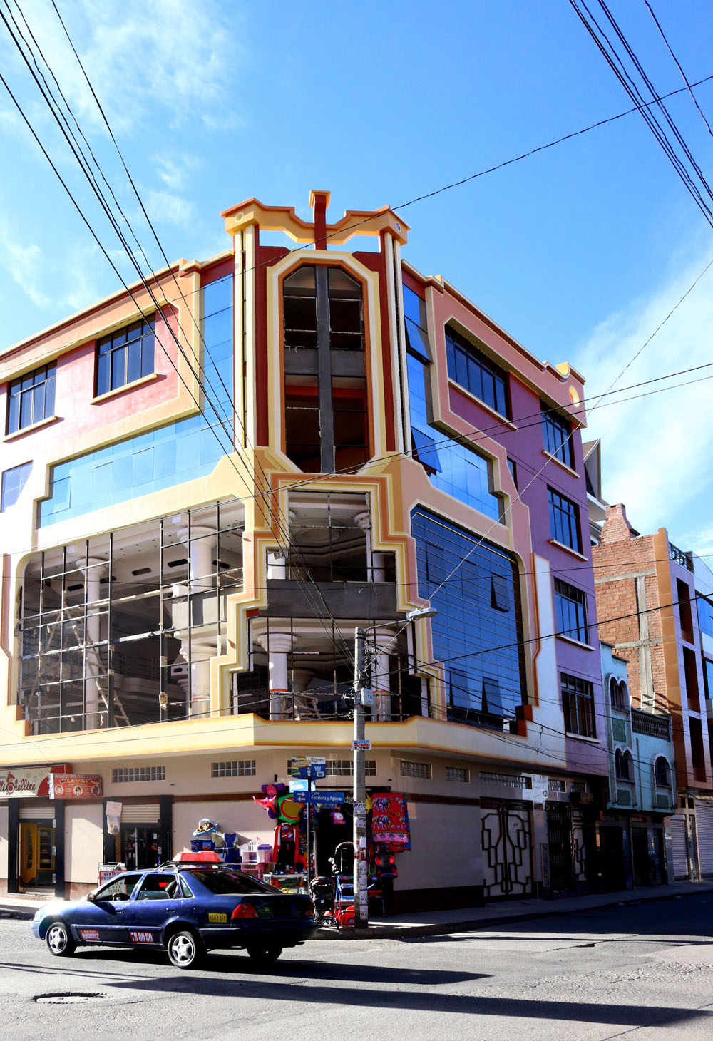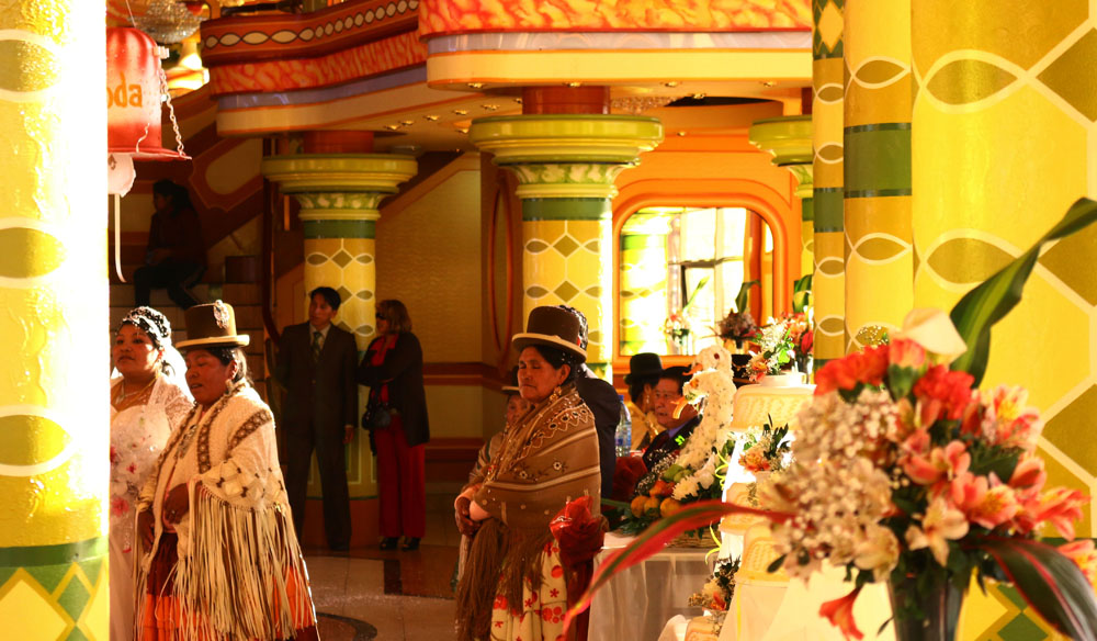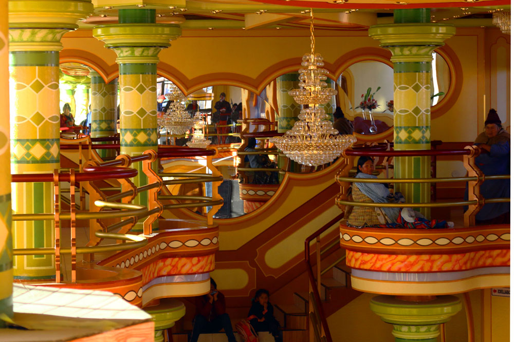 The profusion of cholets indicates a shared desire among Bolivia’s newly empowered lower middle class—which should perhaps be referred to as the “cholita class,” as ethnic background is at least as significant to its construction as economic status—to build homes commensurate with their new station in society. The construction of cholets also signals the permanence of unplanned urbanism in La Paz and the intention of formerly rural Bolivians from indigenous backgrounds to make the capital home. The houses, whose envelopes combine a mixture of columns, arches, and colored glass, sprawl out and hover over quickly built brick and corrugated metal structures. Unlike the stereotypical suburban mansions, cholets are not bounded by large estates but rather are attached and midrise: they often look more like a mini shopping mall than a home. Perhaps unsurprisingly, they are frequently designed by their owners, though some are executed by young architects who specialize in the type, many of whom also come from humble indigenous backgrounds. The buildings utilize colorful exterior murals that are reminiscent of Andean tapestries or shawls worn by cholitas. Inside, they resemble exuberant Bolivian wedding halls and are often used to entertain extended family. Some resemble mini Moorish castles domed with Miami-style blue glass. Others are so immense that they double as commercial spaces that can be rented out for quinceañeras. Many of the homes are, as “cholet” suggests, owned and managed by women as a business, house, and family gathering place—demonstrating the more entrepreneurial role of some women in a culture quickly changing due to city life. All are given grand names, often with a formal nod to Bolivian geography—Illampu (after a Bolivian peak, meaning “the strongest” in Aymara), The Titanic, and El Diablo.
