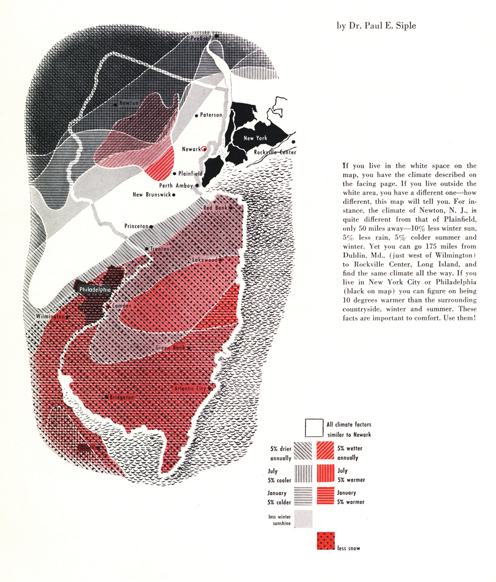 Though originally conceived to present general regional data, Fitch’s insistence that climate data was only useful when precise pushed the researchers toward a smaller scale. In the end, the AIA published thirteen pamphlets analyzing the climatic aspects of thirteen different metropolitan regions. Even here, as seen in Paul Siple’s "Climatic Map of Metropolitan New York and New Jersey," only those within the white band are similar enough for uniform application of the data presented; other micro-regions require additional adjustments, as noted in the key. The AIA also provided charts and diagrams—of solar and wind patterns, of summary thermal conditions—along with a list of techniques to mitigate potential effects. House Beautiful provided more schematic illustrations and an extensive series of articles that sought to convince the reader—the potential client—to engage questions of climate in their own house.