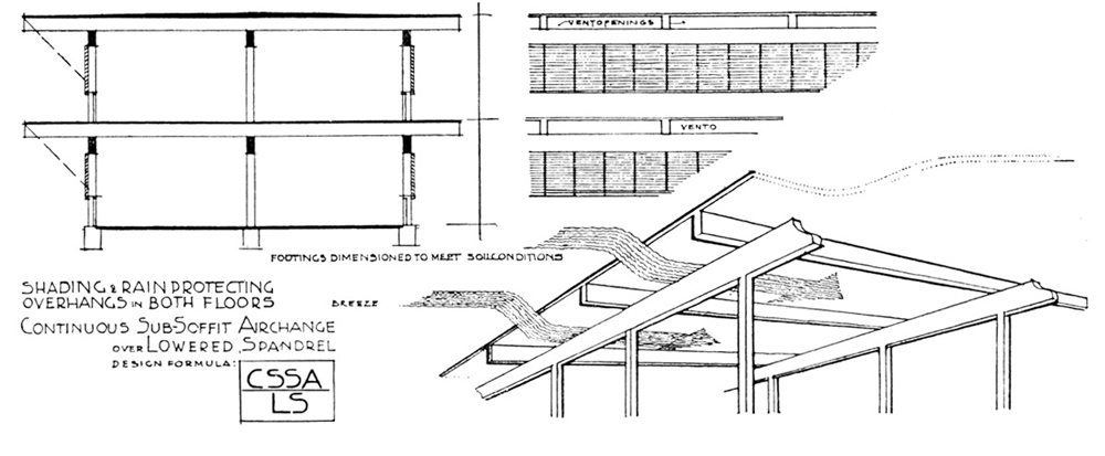 The Form and Climate group at Columbia focused on a specific set of adaptive design methods relative to climate, design tools that were referred to as “negative methods” in the 1950s: the use of the roof or of shading devices to strategically prevent solar radiation from entering a building.1 The basic premise of a negative method, also often attributed to Le Corbusier, is that a well-designed shading fin or extended eave can prevent the sun from entering the interior in the summer and allow it in during the winter. There was heightened interest in such shading techniques from the 1930s to the ’50s; Le Corbusier’s development of the brise-soleil, or sun-breaker, in 1928 was widely published, and quickly spread—or indeed, had spread already.2 The principle of the brise-soleil can be placed next to the domino diagram as another significant intervention on this disciplinary scale—in 1969 Reyner Banham referred to the brise-soleil as one of Le Corbusier’s “most masterly inventions, and one of the last structural innovations in the field of environmental management.”3