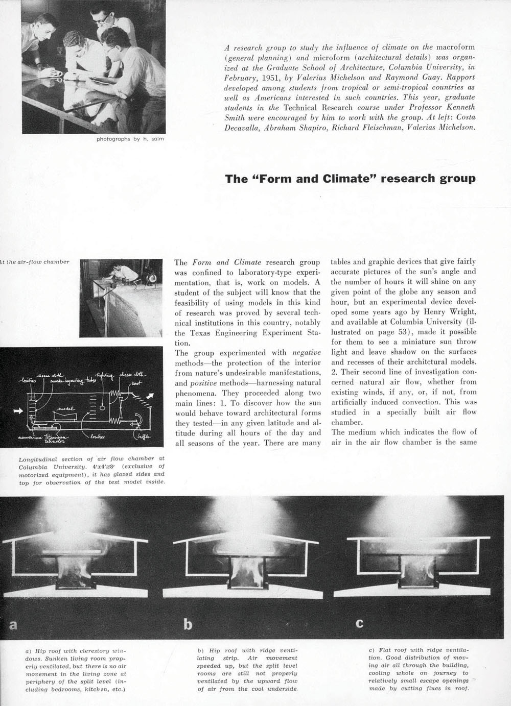 After World War II, as various scientific concepts and frameworks were integrated into design methods—from the meteorological to the biological, from the managerial to the behavioral—some architects began to engage in more detail with how a building could relate to its climatic surround. These investigations, though as yet under-recognized in historical narratives of modernism, were widespread. Some took place at what was then called the Columbia Graduate School of Architecture, where in the early 1950s a group of students organized the Form and Climate Research Group. Working with a number of faculty members, they sought to develop techniques for refining the design process according to climatic adaptability.