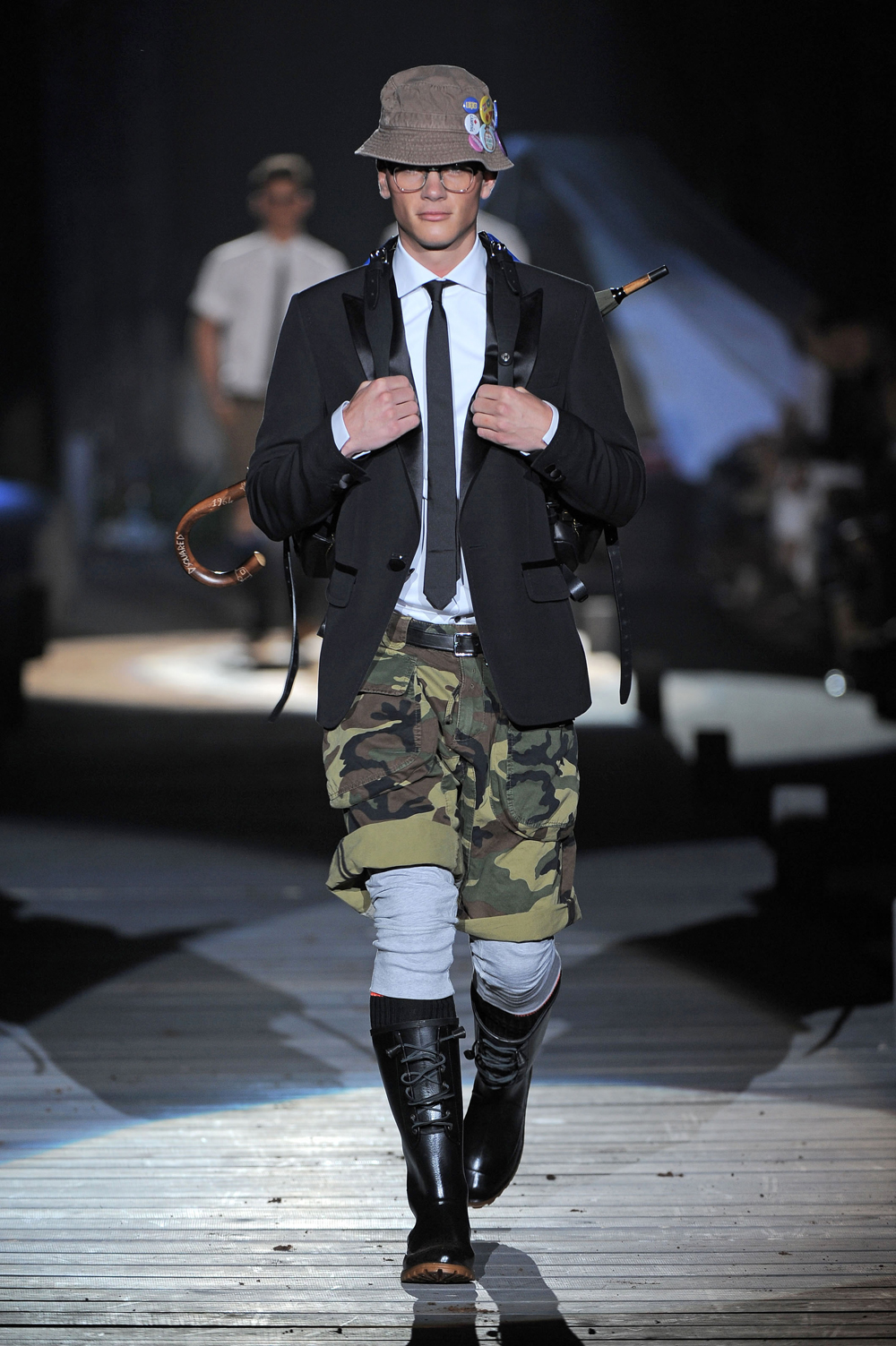 The effects of seasonal disruption on fashion design can already be observed on the runways, in art fashion, and even in the streets. A notable “look” seen in the Summer 2010 show of the Canadian designers Dean and Dan Caten, aka Dsquared2, is a veritable montage of survivalist tropes. The model sports an outdoorsy fisherman’s hat and rain boots, connoting leisurely self-sufficiency in the wilderness, and camouflage shorts, crossing military and hunting motifs. In his stylish gear pack he carries an umbrella, prepared in case of inclement weather. The whole ensemble is immaculately topped off with a black tie and tuxedo jacket that cannot but imply the survival of the 1 percent—a fine outfit for work and play in the age of disaster capitalism.