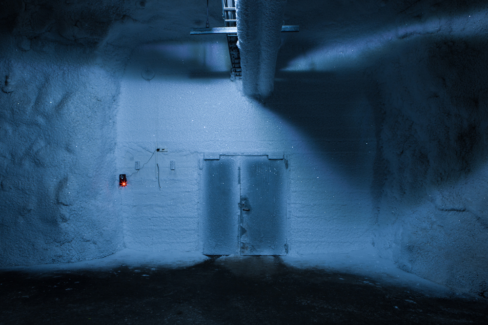 Balkin’s archive likewise relates to archives of a more scientific cast, including the emergency biological “banks” that have proliferated in the last several years in response to growing recognition of an abrupt and sweeping worldwide plummet in biodiversity, which many now consider to be the sixth mass extinction in Earth’s history.31 Take, for instance, the Svalbard Global Seed Vault (SGSV), situated halfway between mainland Norway and the North Pole on the icy island of Spitsbergen. The largest secure seed storage facility in the world, it was established to protect crop diversity as both plant varieties and arable land dwindle due to factors including urbanization, over-farming, pesticide use, and the genetic modification of seeds by corporate giants like Monsanto (one of SGSV’s main financiers). Nicknamed the “Doomsday seed bank,” it currently houses almost one million samples comprising thousands of seed species within the frigid recesses of an Arctic mountain.32 While intended to be tapped at an unknown future date only under dire circumstances, the first withdrawal of seeds was in fact authorized in 2015, upon a request by researchers in Aleppo, Syria, whose own facility was destroyed in the ongoing war there—a war spurred in part by a multiyear drought resulting from climate change.33