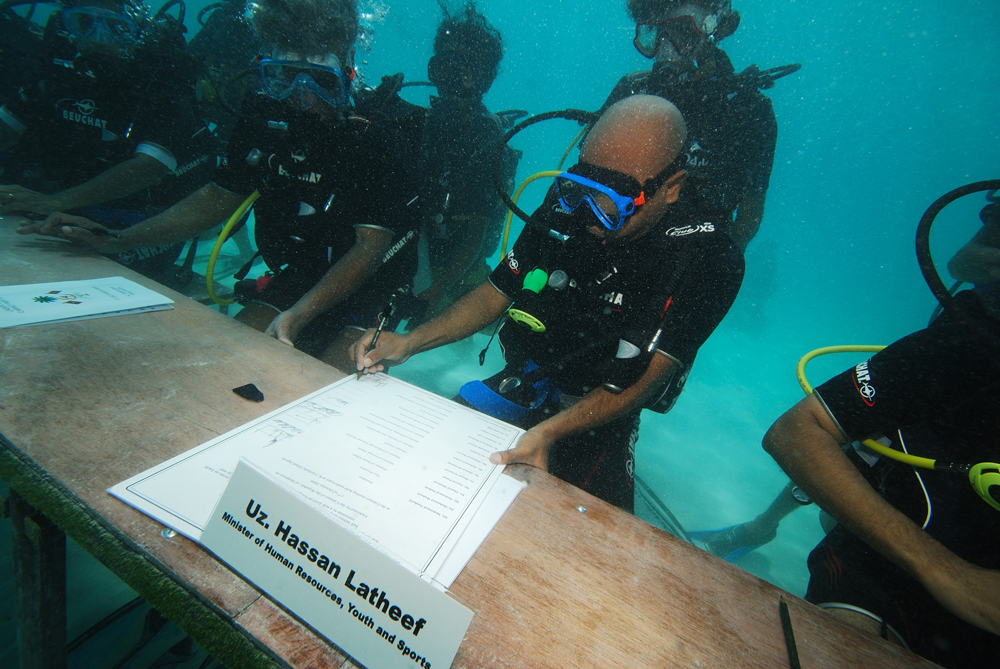 Indeed, one of the key representational challenges that climate change poses is how to maintain a degree of resolution fine enough to capture interrelations that are dispersed across time and space, and are often radically asymmetrical in nature. In his influential book on environmental “slow violence,” the postcolonial theorist Rob Nixon addresses climate change’s “unevenly universal” burden, as well as the misalignment between “calamities that patiently dispense their devastation” and are “marked above all by displacements—temporal, geographical, rhetorical, and technological,” and our spectacle-hungry, “flickering attention spans.”18 In a similar vein, Adrian Lahoud, within the context of his work on climate “forensics,” draws attention to the ways that broad planetary scales veil glaring inequities. In particular, he takes on the 2-degrees-Celsius warming limit that has become a de facto target for international climate policy. He explains, “The violent abstraction of a global average negates the uneven scale of climate impact and erases the specificity of people from its calculation. A two-degree average increase globally would allow for a catastrophic 3.5-degrees” in many places.19 This is, in fact, something that leaders from places like the Maldives, a low-lying island nation at acute risk from rising sea levels, have long argued, as captured in a brilliantly staged protest in the form of an underwater cabinet meeting from which President Mohamed Nasheed and his cabinet ministers sent an “SOS” message to the UN climate change summit in Copenhagen in 2009. In line with climate justice activists, especially those from the Global South, Lahoud calls for “a different scale of calculus,” one that would possess “just enough resolution to catch the uneven effects of temperature increase.”20