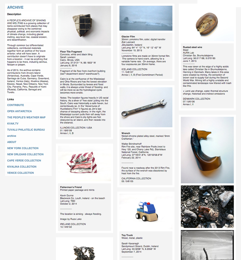 A People’s Archive of Sinking and Melting is a representation—if we want to even call it that—which likewise addresses the world as it is breaking through a series of acts that are at once mournful and lively, idiosyncratic yet related. In contrast to a techno-scientific view from above, its objects-acts reflect positions on the ground. Any fantasy of discrete sites and events, however, is replaced by a loose set of alliances drawn between people in places that are undergoing related processes of environmental destruction.
