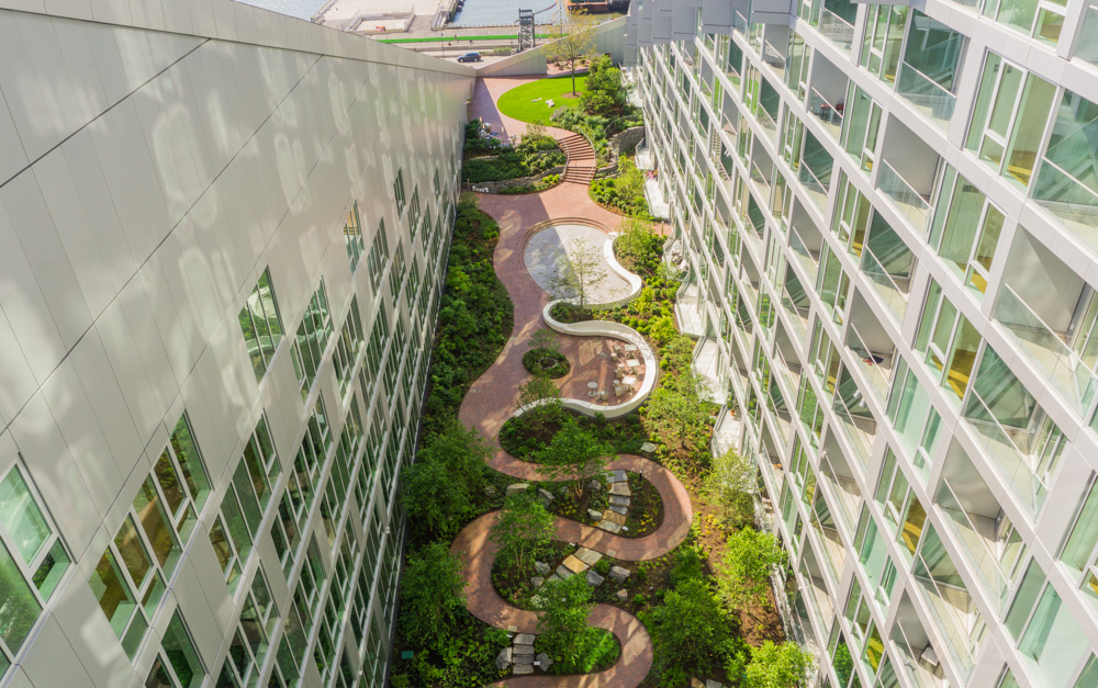 Via’s courtyard has the feel of a utopian space where residents would form community. Touring the garden, I imagined a resident spying a barbecue party from her balcony and coming down to join or a child calling up from the courtyard to a friend to gather enough players for a game. When Ingels calls the Via courtyard a “bonsai Central Park”—at the same proportions, if thirteen thousand times smaller—it is more than a marketing ploy. Starr Whitehouse partner and Via landscape architect Laura Starr is a former Central Park Conservancy chief of design. She told me that producing natural-feeling, manmade landscapes is “hard enough to do in Central Park. Here, the challenge was making a garden on structure.” Importing a Central Park design philosophy, Starr used forty-seven species of native plants to make the courtyard feel like it was “transported from nature.” The design disguises the fact that the garden sits above the building’s 285-space parking garage, overcoming technical challenges, including complex drainage issues.