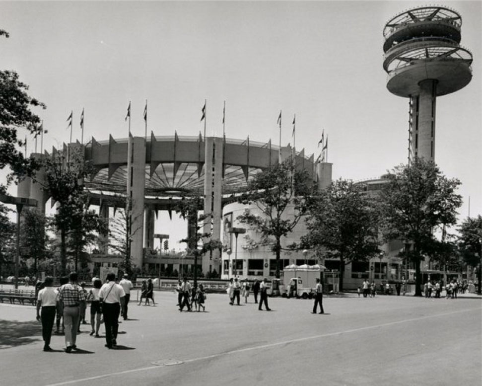 The 1964–1965 World’s Fair was dedicated to “Man’s Achievement on a Shrinking Globe in an Expanding Universe” and its theme was “Peace Through Understanding.” The whole production—the assemblage of buildings, artwork, and programming—was intended as a tour de force of state representation and a surround experience that virtually anticipated IMAX today. Among the most iconic exhibits was the New York State pavilion, which was comprised of the Tent of Tomorrow, the “Astro-View” observation towers, and the Theaterama.