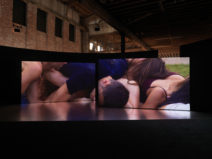Gerard & Kelly’s two-channel film, Schindler/Glass, completed in 2017 and exhibited this summer at Pioneer Works in Brooklyn, begins in New Canaan and slowly fades into Los Angeles. The dancers perform intimacy and desire in a multitude of forms, ranging from what could be a warm, affectionate relationship between sisters to an intensely erotic liaison between two men. At New Canaan, the dancers take full advantage of the multitude of vantage points afforded by the main house’s translucent walls and accentuate the spatial relationship between the three structures on the grounds. A pair of dancers weave in and out of the concrete arches of the outdoor pavilion, while a third walks around the bed inside the Glass House. Alongside original music by Lucky Dragons and SOPHIE, there are the sounds of birds and the steady, pulsating calls from the dancers, “1, 2, 2, 3, 3, 3, 4, 4, 4, 4…” Their voices float in and out of the main house, where a young woman lies nude on Mies van der Rohe’s black Barcelona daybed. She whispers intimate memories of past rendezvous, the kind that you repeat to yourself while lying in bed at night, alone: “Your sheets were softer than mine…Seeing your silhouette in the shower…your sweat dripping onto me…”