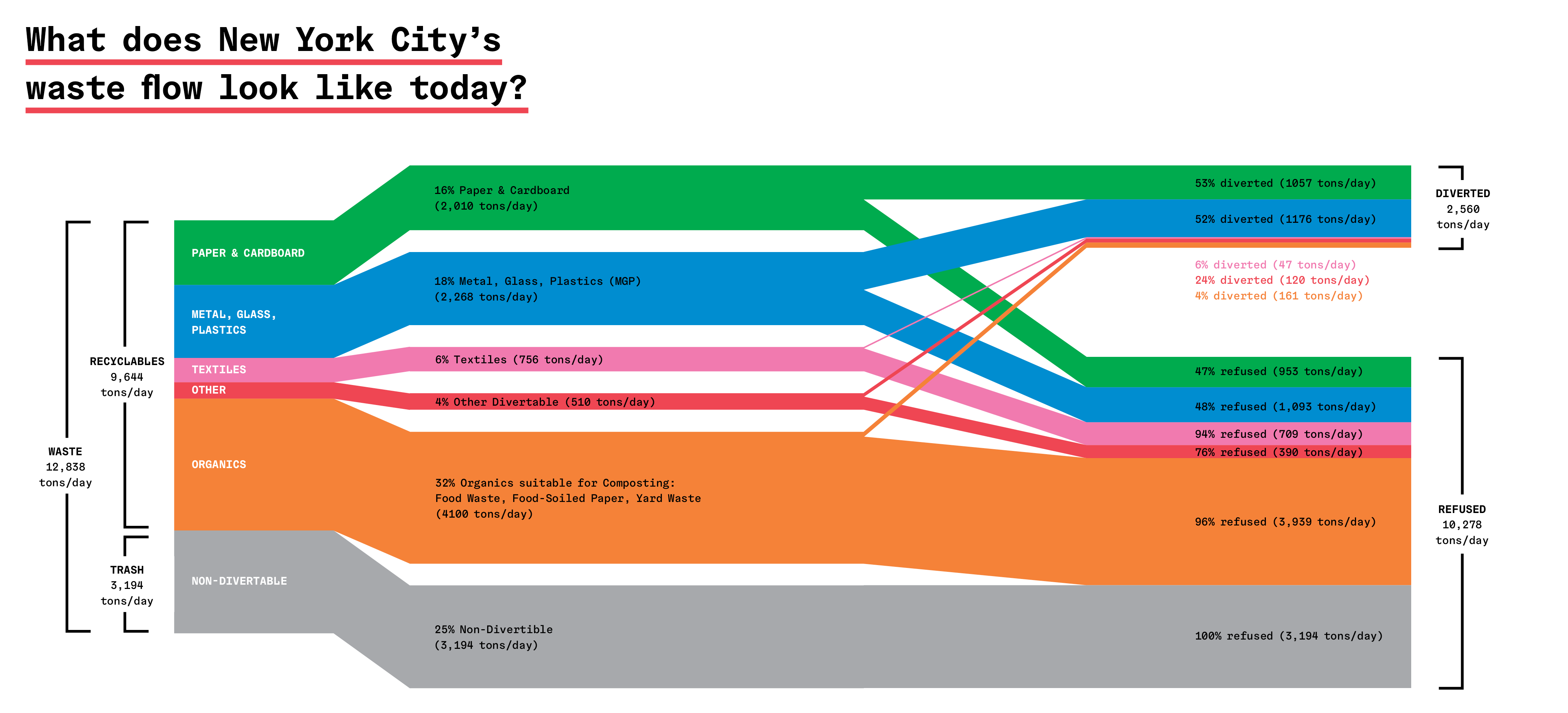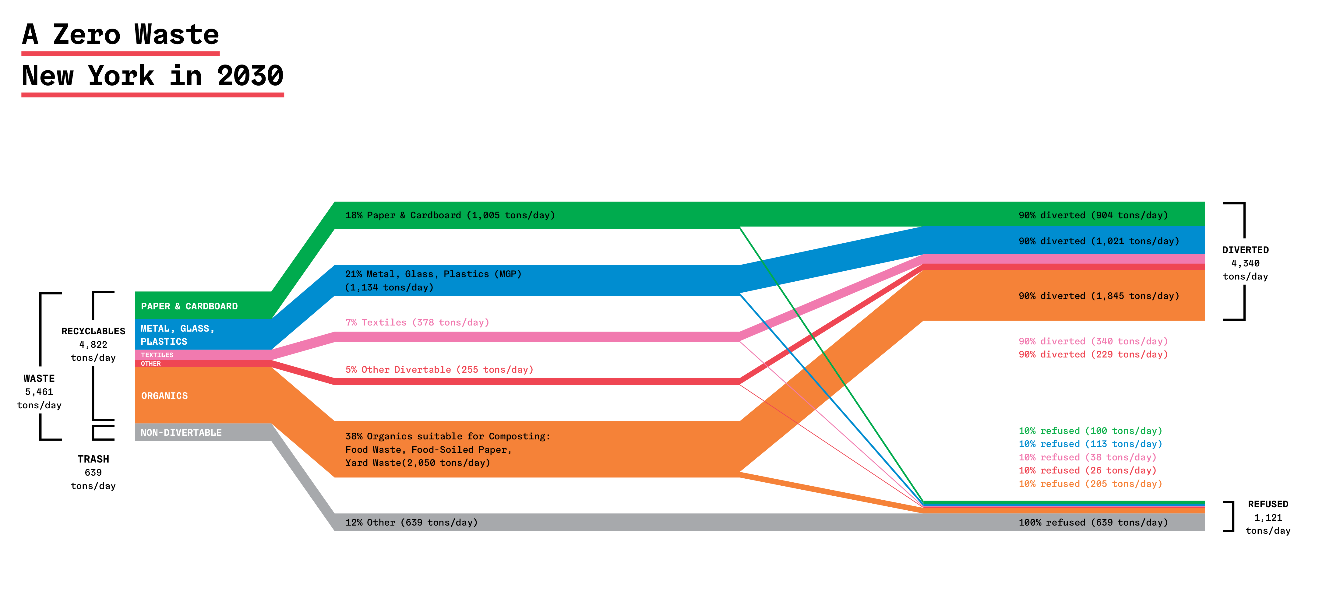 In 2015, the city established One New York: The Plan for a Strong and Just City, a strategic plan to address its most pressing challenges including aging infrastructure, job growth, inequality, and climate change. As part of that plan, the city aims to become a leader in solid waste management. The overarching goal is to achieve Zero Waste by 2030, with an aim of reducing the amount of waste the Department of Sanitation (DSNY) sends to landfills by 90 percent, from a 2005 baseline of 3.6 million tons.3 At face value, “zero waste” can be understood as eliminating waste sent to landfills and incinerators, but in a larger sense it describes a circular and metabolic idea of the city—of how waste can be rethought of as raw resources to be recycled, reused, and diverted into new afterlives: discarded food converts into energy, junk mail transforms into pizza boxes, etc.