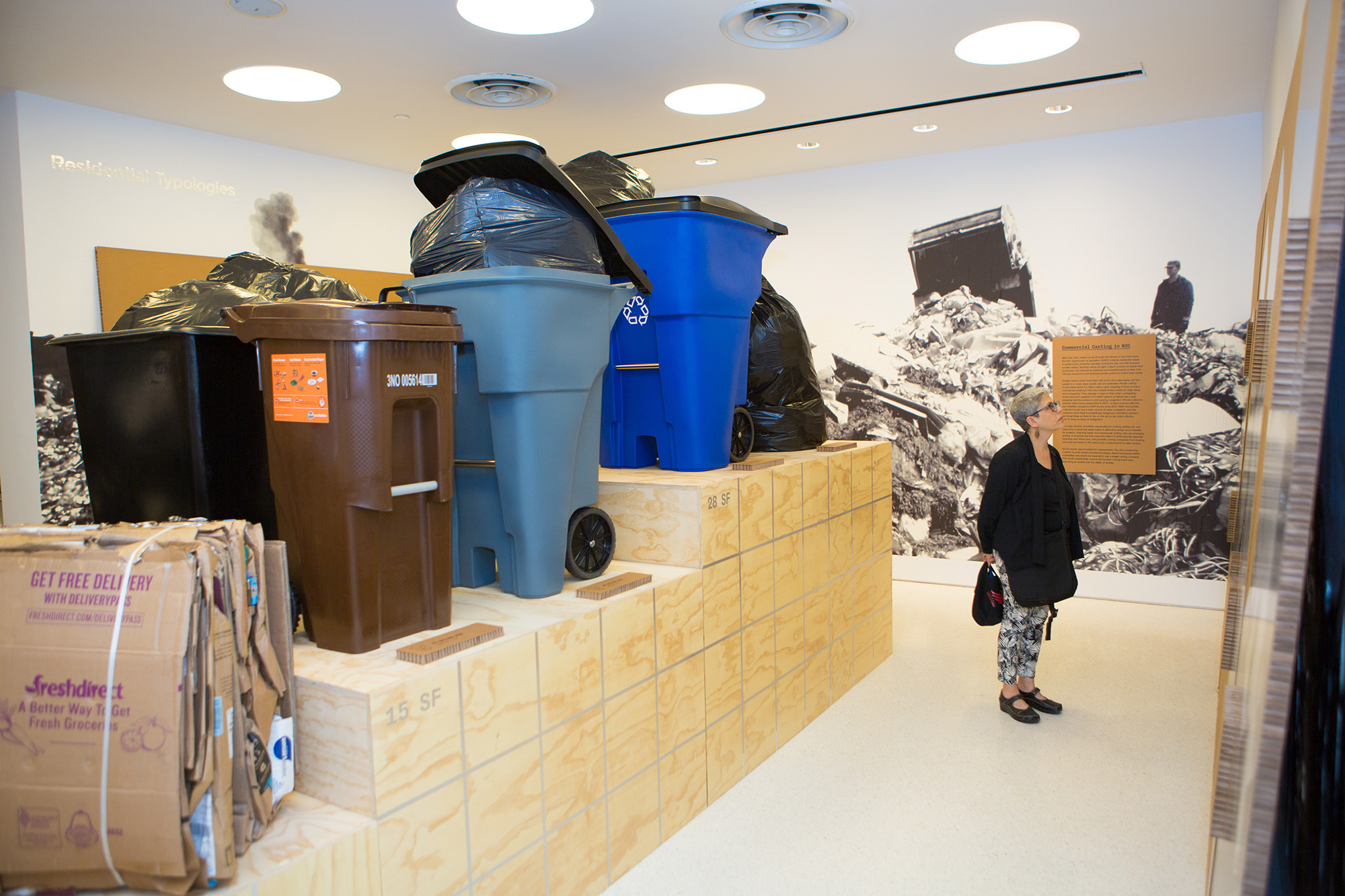 Upon entering the Center for Architecture, visitors are confronted with a monumental display of various New York City Dumpsters and bins (organics, trash, recycling), as though the sidewalk had found its way inside the exhibition space. They are filled with trash bags and stuffed with cardboard, arranged on a tall, stepped plywood podium that doubles as a physical bar chart by visualizing the waste volume in the bins on top of it. It is the analog companion to the adjacent Waste Calculator, an interactive tool that’s set up immediately in front of the trashy podium. Made up of a plywood bench, table, and set of screens set atop plastic crates, the Calculator displays information about the waste storage capacity of particular building types and makes recommendations for containment strategies to manage the waste stream. This, along with the rest of the exhibition’s content, is based on a portion of the Zero Waste Design Guidelines—a set of design tools, implementation strategies, and best practices compiled by a multi-disciplinary group to “address the crucial role that design plays in achieving NYC’s ambitious goal, outlined in One New York, to send zero waste to landfills by 2030.”7 The Guidelines document is geared toward designers more so than to a general public and is an engaging and in-depth guide to the issues of waste in New York City that both capture and balance the broader issues at stake when dealing with waste in the city as well as the granular scale of those implementation strategies.