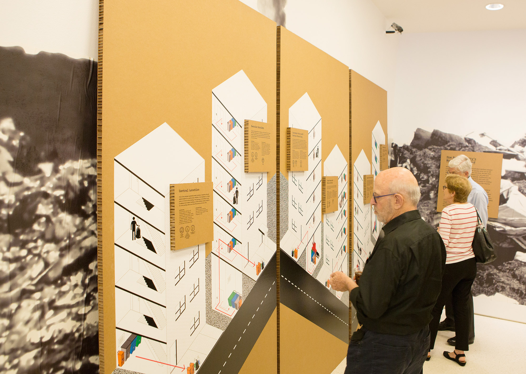 Spread across two floors of the Center for Architecture, the exhibition connects the disparate spaces with a consistently bold graphic language and even leads viewers through an unfinished “backstage” storage area of the building, with a permanent installation illustrating the Center’s own sustainability measures and efforts to manage waste. It is organized into roughly four themes that are visually bound together with supergraphic blow-ups of landfill imagery and the Sims Recycling Center in Brooklyn’s Sunset Park. By superimposing wall graphics with thick, recyclable cardboard panels that are both hung and leaned against the walls displaying infographics and wall text, the design produces pockets of immersive space, using the very materials of a traditional recycled aesthetic that are described on the wall. The four themes overlap in content but might loosely be distinguished as (1) where we are and where we want to go; (2) building case studies; (3) labor of waste management; and (4) best practices. Altogether, the exhibition prompts viewers to consider how design might play a role within these waste systems. It nods to the work of Donella Meadows’s systems-based approach, jumping from the different scales of citywide waste networks to the finite scale of sorting one’s own compost.6 This multi-scalar approach raises the show’s central question and tension—is waste a dilemma of management or of design, or both? If it is both—which is what the exhibition suggests—then applying design thinking to concerns of management and civic agency can make a productive impact and enable steps toward new alternatives. From a broader disciplinary perspective, however, the scope of the exhibition at times seems to offer a more limited capacity for design’s potential, favoring the juxtaposition of pragmatic problems with literal solutions.