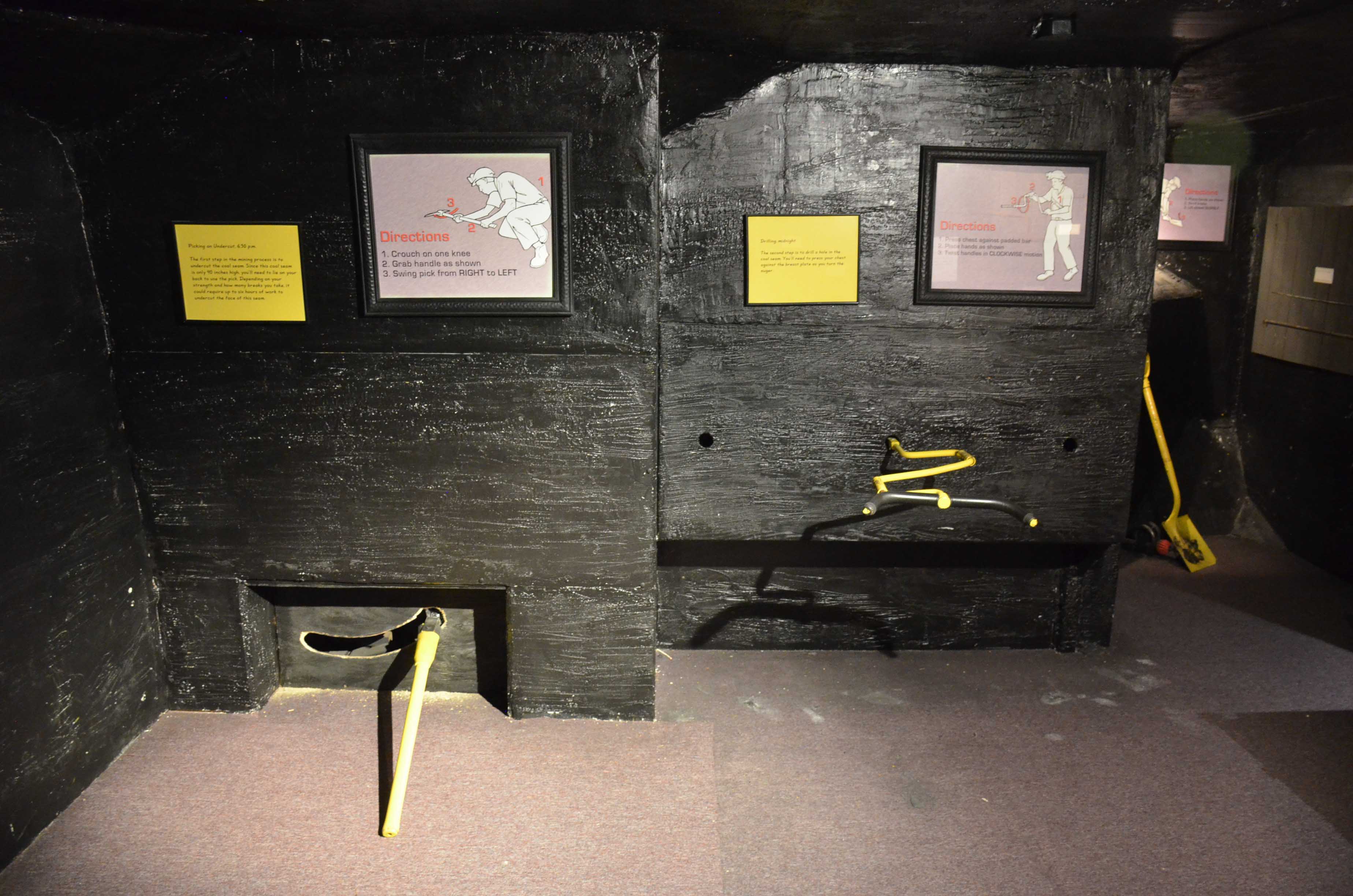 “I keep this door closed for dogs, kids, and bears,” our guide, Tammy, tells us as she opens the portal for the day. On the inside of the gate is a painting of a mule, memorializing the mine’s three hundred nonhuman laborers. The walking route makes a loop and exits through a different portal, likewise marking out a history of mining techniques and preserving some of the geological oddities—fossilized fish, kettle bottoms—that pervade the mines. In the 1960s and ’70s you could drive through the exhibition mine (the exhaust of the cars ended up eating away the varnished protection of the coal), and the signage and displays are still arrayed for vehicular viewing. This is decidedly high coal, with a range of around twelve to fourteen feet in height, and its proximity to the grade level of the valley outside made for comparatively easy work, if one could say such a thing about such hard and dangerous labor.