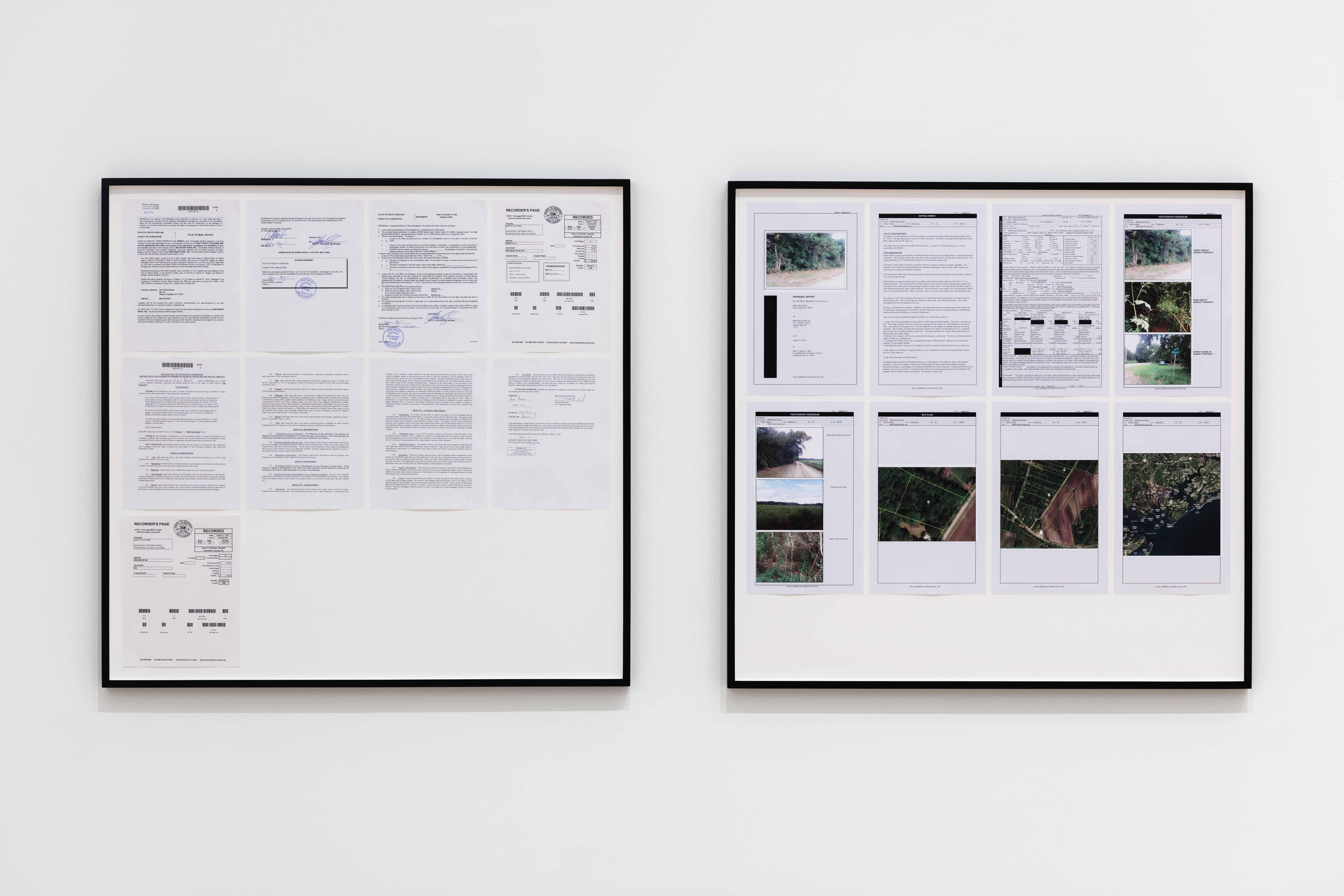 The parcel of land that Rowland purchased was once part of the Maxcy Plantation on Edisto Island, where ex-slaves were contracted to work. Its precise coordinates and features are detailed and illustrated in an Appraisal Report (on display), issued following the sale, which valued the land at $0. Snapshots depicting a nondescript, overgrown lot appear alongside photos of property boundary lines and a trio of exponentially distant satellite images of the site. The work itself, however, is perhaps best understood as a spatial construct, one that coalesces a series of transactions and provisions.