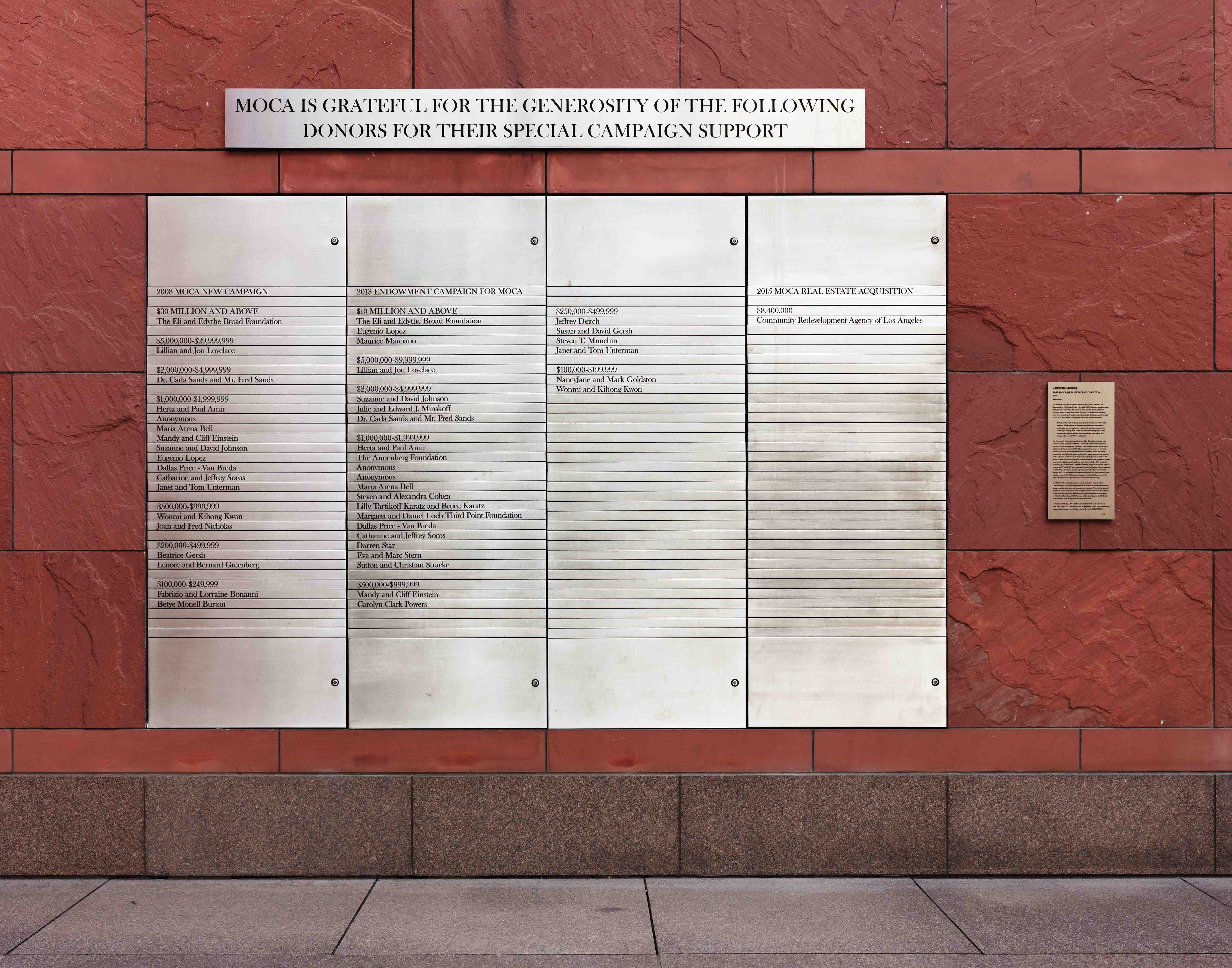 To call attention to this sequence of historical events, no matter how unimpeachable (Rowland is a careful writer, offering facts over interpretation), within the sacred space of a museum’s donor wall is fairly outrageous—at least through the eyes of an institution. Though today it is not uncommon for a museum to foster critique through commissioned work, supporting artists’ incisive readings of its institutional status, MOCA, in fact, initially declined Rowland’s proposal for the donor plaque, acquiescing only after extensive negotiations.5 The transparent acknowledgment of philanthropic gifts can be critically interpreted in many ways. Yet the purpose of a donor wall, generally, is to laud generosity and celebrate investment in a shared cultural future—not to excavate a history of disenfranchisement or, as in the rather unique case of MOCA, to re-entangle that history of disenfranchisement with the ongoing sources and methods of financial support that allow the museum to fulfill its mission.