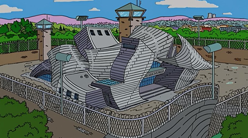 More than a decade later, after the cultural moment of Bilbao had set in, he lent his voice and image to a particularly canny episode of The Simpsons. In it, the cartoon Gehry receives an earnest request from Marge (on Snoopy stationery) to design a concert hall for the town of Springfield. Immediately uninterested, he crumples the letter—as Gehry is wont to do in the mythology of his design process—but finds the result so inspiring that he is moved to realize his own gestural creation. Mrs. Simpson will get her architecture: a superstructural grid that is bent into shape by a chorus of wrecking balls. In the third act, the building falls into disuse as Springfield residents prove unmoved by the high culture of a concert hall and is subsequently reopened as a prison. It’s a strange reversal of the redesign we find him pushing for in this 2018 work of nonfiction, where he voices architecture’s potential to rehabilitate. Gehry has since expressed regret for his participation in the episode, not because of the prison punch line but because it cemented the misunderstanding of his creative practice as Pollock-like—an action-painting style of modeling that produces something to be constructed by more expert builders.16 Given his apparent comfort with the prison as cartoon or folly, you might see how the idea of the prison has loomed larger in Gehry’s imagination than the reality of him ever designing one.