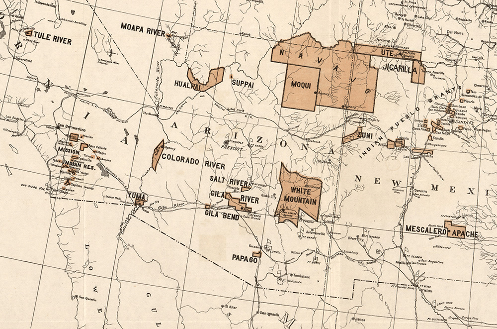 In that same forty years, the US Government and the Apaches fought an ongoing war in part about the status of the border and who had the authority to cross it. During this time, the Apache were systematically hunted with the goal of extermination.20 And when that proved logistically and political difficult, they were removed from the border region and confined to reservations, first in places like Santa Lucia near the border and later, after neither the US Army or the Bureau of Indian Affairs could stop cross-border hunting, trade, and raiding excursions, farther north. The boundary markers failed to confer the image of American sovereignty, and so other spaces were required to contain indigenous populations and restrict their movement. Many of the tribes, both Apaches and others, were forced to acclimate to state-approved forms of life, to adhere to an idealized vision of American property ownership—cultivating the land, maintaining a home—and therefore to more “civilized” conduct.21