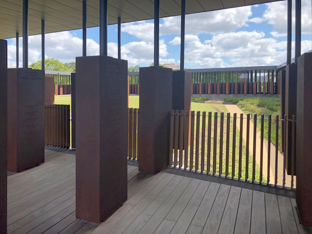 Entering this memoir ongoing is a slow, deliberate process, fraught with difficulties both real and imagined. Understanding the folly of approaching the complexity of such terror with reckless abandon, the six-acre testimonial of the Peace and Justice Memorial—essentially a square, open-air structure housing eight hundred six-foot rectangular, column-like, corten steel blocks inscribed with the names of almost five thousand victims of racial violence suspended from the ceiling—cannot be approached full-on. In a test of one’s will to know, visitors must climb, turn, and twist just to enter. To reach its open center, a small grass mound from which the racial/spatial relationship of a nation can be read on a city—at its historical heart, the legacy embodied in the first Confederacy capital and the river that transported Black gold to warehouses and auction blocks slinking by just beyond; buffeted on its flanks by the city’s oldest AME congregation and its newest equal justice warrior, standing like sentinels, prepared for yet another of what seems a never-ending, no-quarter battle with that legacy’s entitled progeny—much patience is required, and rewarded.