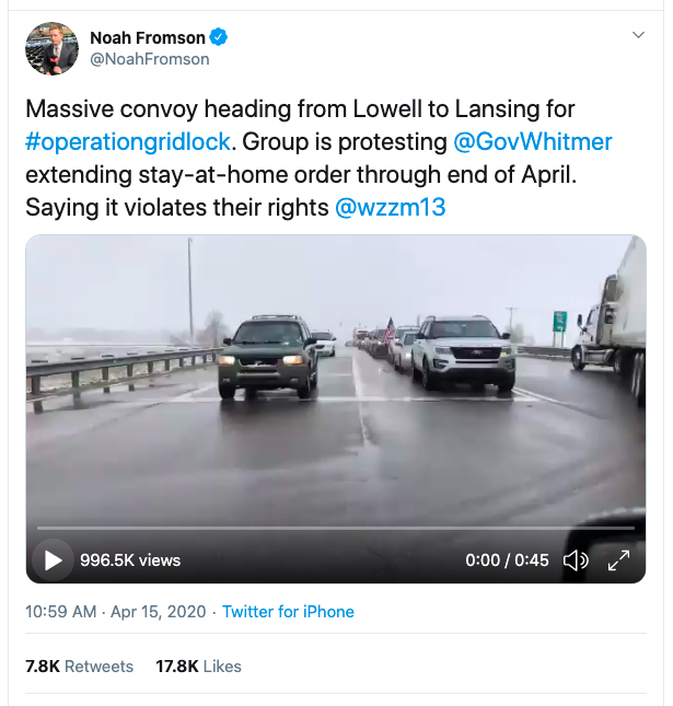 Adam Gabbatt, “Protests against US stay-at-home orders gain support from rightwing figures,” April 16, 2020, the Guardian, link. See also Delilah Friedler, “Activists Are Still Taking to the Streets—in Cars,” April 3, 2020, Mother Jones, link, and Kea Wilson, “CAR ‘SIT-INS’? Drivers Are Drowning Out the Voices of the Most Vulnerable During COVID-19,” Streetsblog USA, link. ↩