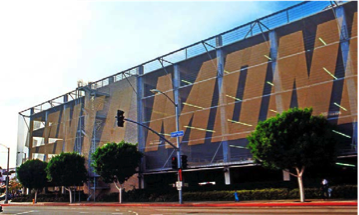 Although scrim had been used for many years as reinforcement for plaster construction, it was introduced as an expressive element on the façade of Gehry’s Santa Monica Place parking garage in 1980, bearing the name of the mall in gigantic lettering. The scrim became a staple of Morphosis’s stratified “dead-tech” façades, beginning with a curved topiary wall for the unrealized MTV studios in 1990, through to the Salick Healthcare Office in 1993, and most extensively in the façade of the Caltrans Headquarters, constructed in Downtown Los Angeles in 2005. Like the early Santa Monica Place façade, the Caltrans scrim acts as both sign and filter, displaying the address of the building while sheltering the windows of the offices inside. In more recent years, as elaborate, multilayered façade systems have become one of the fads of sustainable architecture, the scrim has become associated with “green building.” It is both a sacrificial covering and a symbolic gesture toward environmentalism. In these building envelopes, the scrim, which was once meant to recall ruined technology, is now described in organic terms as “breathable skin,” returning to the animism of Jencks’s original interpretation while substituting bodybuilding with a passive and benign building-body.8