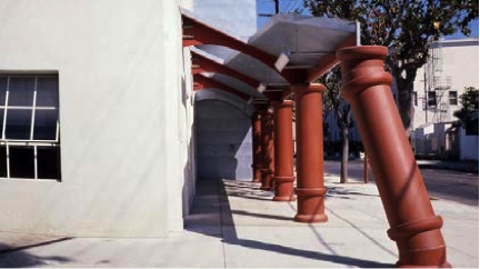 In this dramatic interpretation, the static and inanimate elements of Moss’s architecture are imagined as living tendons, bursting out of their traditional confines through heroic effort. These kinds of staged displays played out across the city, beginning in the late 1970s with Frank Gehry’s double-wrapped Santa Monica House, to Eric Owen Moss’s plumbing columns at Paramount Laundry in Culver City, to Morphosis’s “play sculpture” inside the Cedars-Sinai Cancer Center in Beverly Hills. Alternately labeled “plus modern,” “technomorphism,” and “en-formality” by the numerous architects and critics who sought to unite the work under the banner of a cohesive school, many of these projects involved the juxtaposition of some standard structure with a fragmented, layered, and didactic assembly of “as found” materials—exposed concrete, weathered steel, chain-link fence, plywood, corrugated aluminum, and with increasing frequency, metal scrim.7
