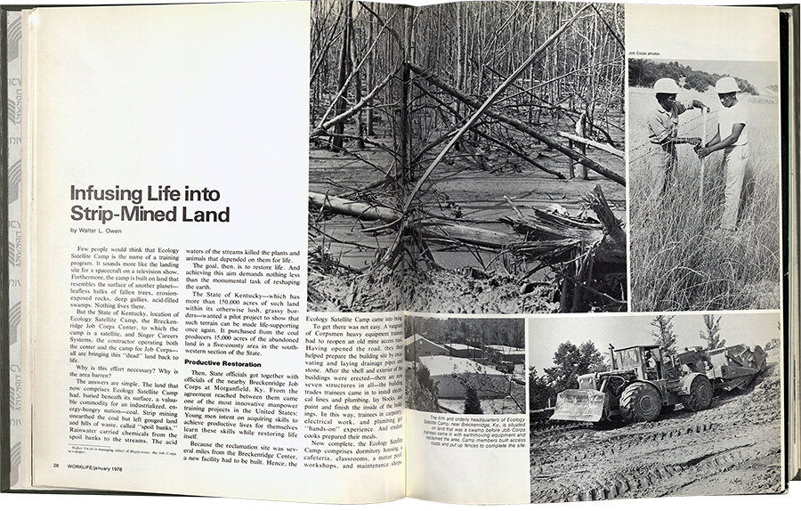 While Manpower and other literature promoting Department of Labor programs collapsed an impoverished Black subject onto blighted cities, a corresponding sense of “ecological surplus” fueled contingencies between newly mobile workers and a useful environment.40 A 1971 article “Into the Forest and Out of the Woods,” described the impact of Operation Mainstream, a two-year training program that put undereducated and chronically unemployed adult men to work building trails, performing fire control operations and “environmental beautification” in order to teach masonry, carpentry, and other skills. As the author put it, “Human resources develop natural resources. But the reverse is also true. Some of America’s most valuable natural resources, our national forests, are being used to develop our human resources.”41 An article in the 1976 issue of the magazine, by then reformatted under the title Worklife, asserted similar productive life cycles in environmental rehabilitation: “Infusing Life into Strip-Mined Land” covers a Job Corps satellite camp in Kentucky, where environmental reclamation of “dead land” laid bare by the surface mining of coal was performed by young Corpsmen, temporary residents of the camp they were enlisted to construct.42
