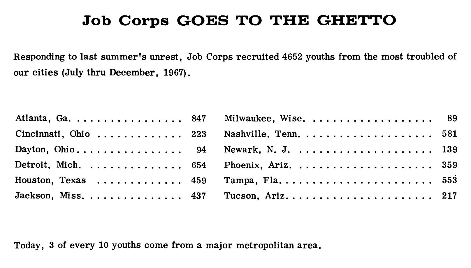 As the program is introduced: “The Job Corps task is not an easy one. Job Corps must convince youth that they can change their lives. They have known only failure, degradation, and ignorance. The typical enrollee comes from a broken home, drops out of school after nine years, cannot read a newspaper or magazine, and has no hope of qualifying for employment. His horizons do not extend beyond the despair in which he exists. Job Corps represents his last chance. Without a Job Corps program, thousands of youngsters face continued poverty, illiteracy, unemployment, delinquency, and hopelessness.” In Job Corps Reports, 3. ↩
