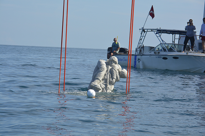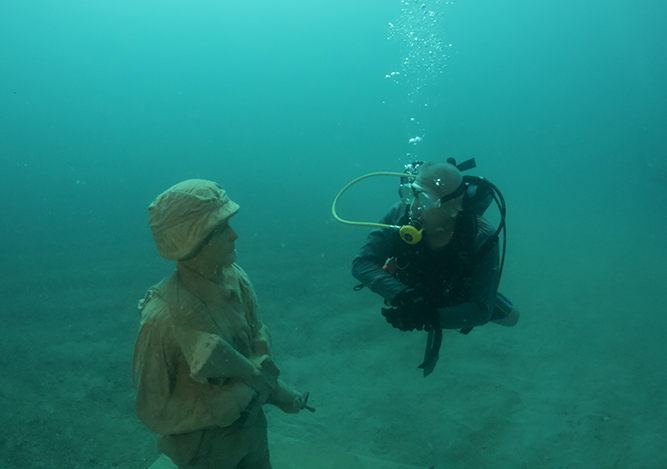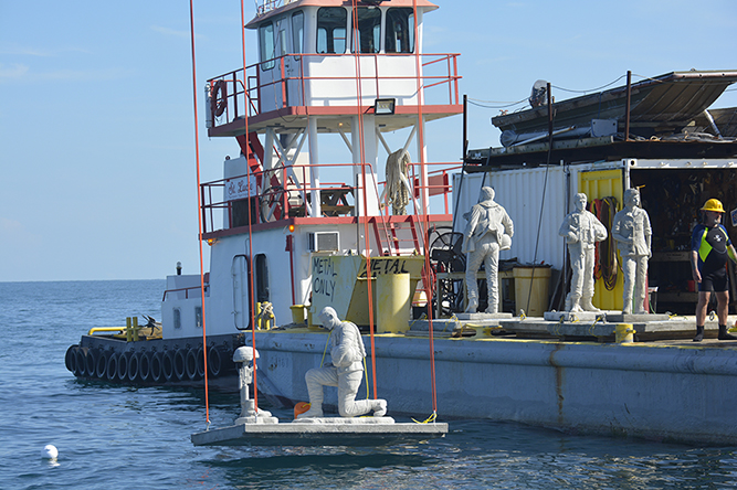 While promoted as having grand patriotic, ecologic, and economic ambitions, the Circle of Heroes is only half-realized. Once complete, the underwater installation will be made up of twenty-four statues, ultimately forming a circle one hundred feet in diameter. In coordination with the US Coast Guard and Army Corps of Engineers, the first twelve figures were lowered into place from a barge in late June 2019, followed by a formal dedication ceremony on August 5. Before the COVID-19 pandemic and subsequent economic crash, the next twelve were anticipated to be installed on either Veterans Day 2020 or Memorial Day 2021.13 This second set of sculptures remains to be fully financed.