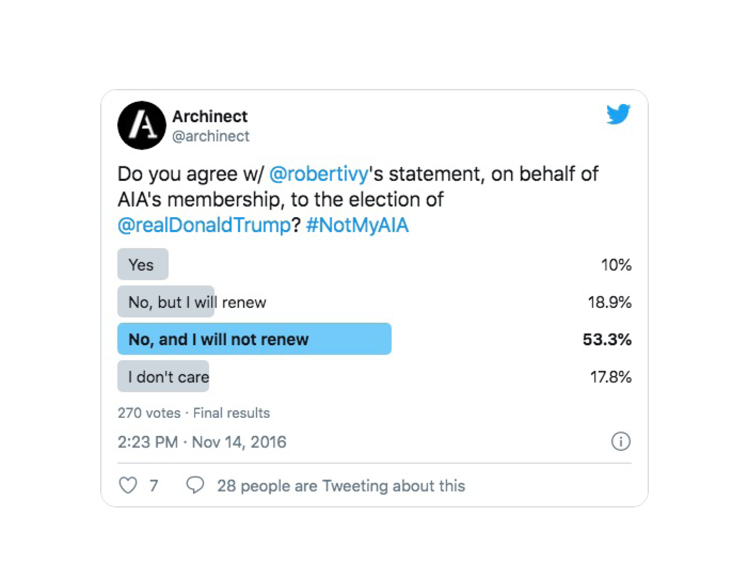 This second reading of this statement was ironically given the lie in 2016 when the AIA drew the “ire” of many members after its executive vice president and CEO, Robert Ivy, released a memo stating the AIA was committed to working with then President-elect Donald J. Trump and his administration. Overlooking the multiple forms of blatant bigotry that formed the foundation of the Trump campaign, Ivy’s memo solely focused on the $500 billion Trump promised to spend on schools, hospitals, and other public infrastructure.7 Yet, given the uniquely explicit and bombastic rhetoric of the Trump campaign, the AIA found it harder to separate politics from professional practice as many members recoiled at any appearance of official support for Trump; for a brief period #NotMyAIA paralleled #NotMyPresident.8
