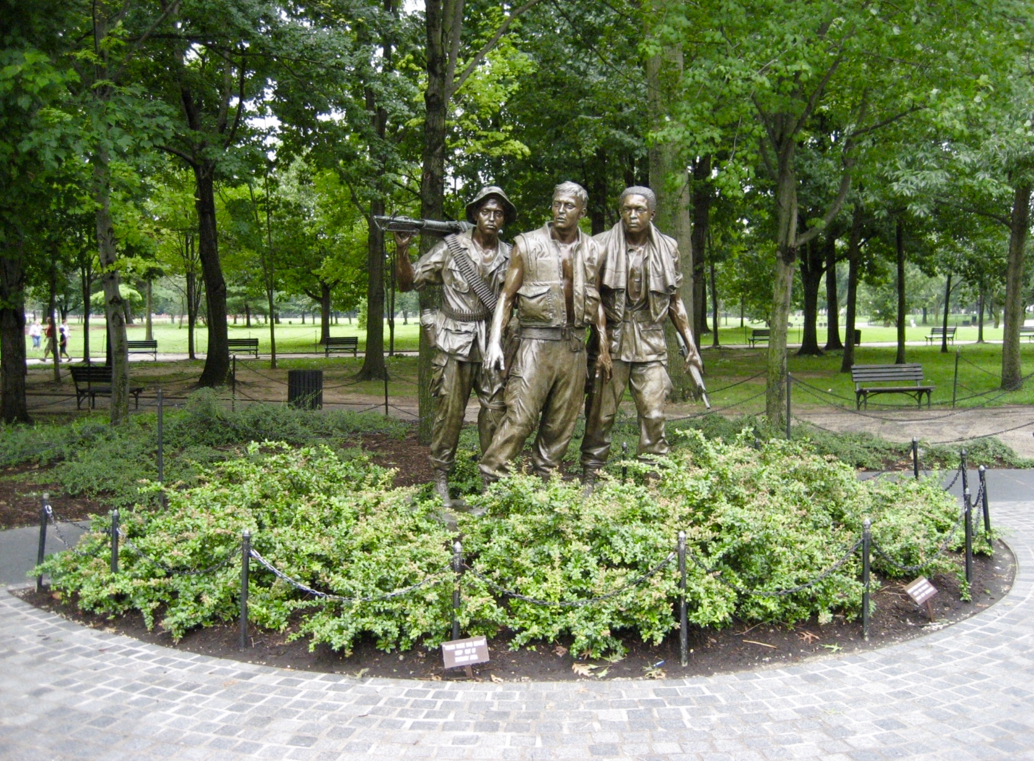 Lin’s design, a physical rift in the ground that exposes a polished, black stone wall with carved names, decenters the political context of the Vietnam War, focusing instead on the loss of the individuals themselves. The design uses landscape to make this point. As the visitor descends the sloped pathway that abuts the wall, the wall grows taller, and the names grow in number. The memorial’s apoliticism is, of course, a political stance. Responses were visceral. According to sociologists Robin Wagner-Pacifici and Barry Schwartz, critics saw Lin’s break from aesthetic tradition as presenting a “nonpatriotic and nonheroic” message, instead imbuing the memorial with a sense of shame.19 In response to these critiques, changes were made to the memorial shortly after its unveiling. These included a flagpole, plaques, and The Three Soldiers, a bronze statue by artist Frederick Hart depicting servicemen in action. Historian Meredith H. Lair argues that each “of these addenda to the memorial represented a constituency that argued that its needs were unmet by the original design.”20 The Vietnam Veterans Memorial is now considered en masse, with Lin’s design and these built interventions linked together under the same header. As a further corrective, an education center that would act as a political and cultural counterpart to the memorial was planned for an adjacent site, though this effort was canceled in 2018 due to challenges with fundraising.21