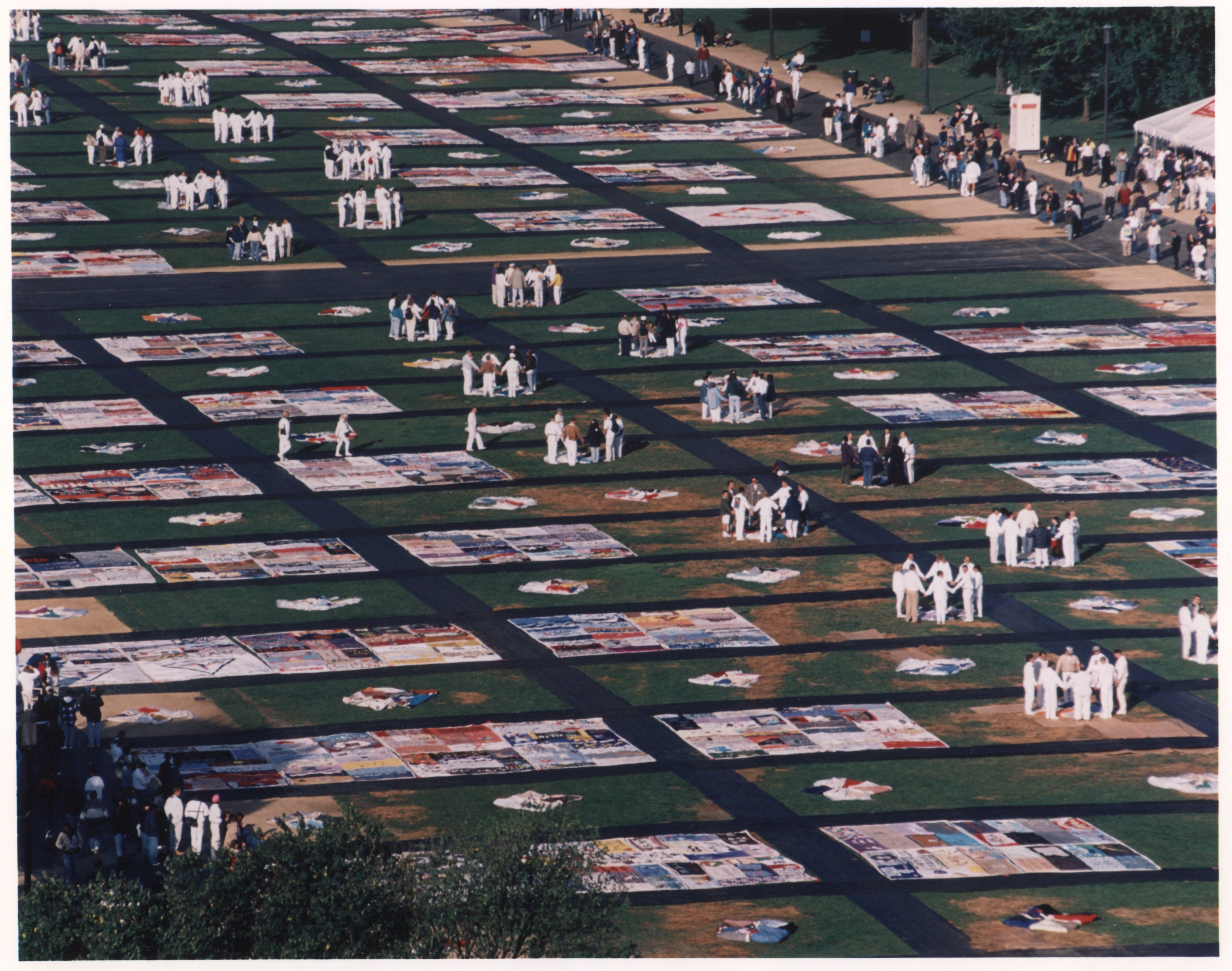 Another AIDS memory project, the AIDS Quilt, was conceived by activist Cleve Jones in San Francisco in the same year that the Grove was taking shape—“just down the street from each other,” adds Cunningham.34 At once a commemorative project and a political instrument, the Quilt is made up of individual 3-by-6-foot stitched panels—a symbolic nod to the standard dimensions of a coffin—that feature the name of someone lost to AIDS-related complications. There may be stitched mementos, memorabilia, or embellishment, or not; it is at the discretion of the maker, most often a friend or family member, but in some cases a stranger. The Quilt’s debut at the 1987 San Francisco Lesbian and Gay Freedom Day Parade featured forty of these panels. Later that summer, the Quilt, then at 1,920 panels, was laid out on the National Mall. This would occur again in 1989, and in 1992, and in 1993, the Quilt having grown in each subsequent appearance.35 In its 1996 installation, the Quilt covered the entire length of the Mall. Now-famous images of the event show an immense assemblage of hand-stitched panels stretching from the Washington Monument to the Capitol.