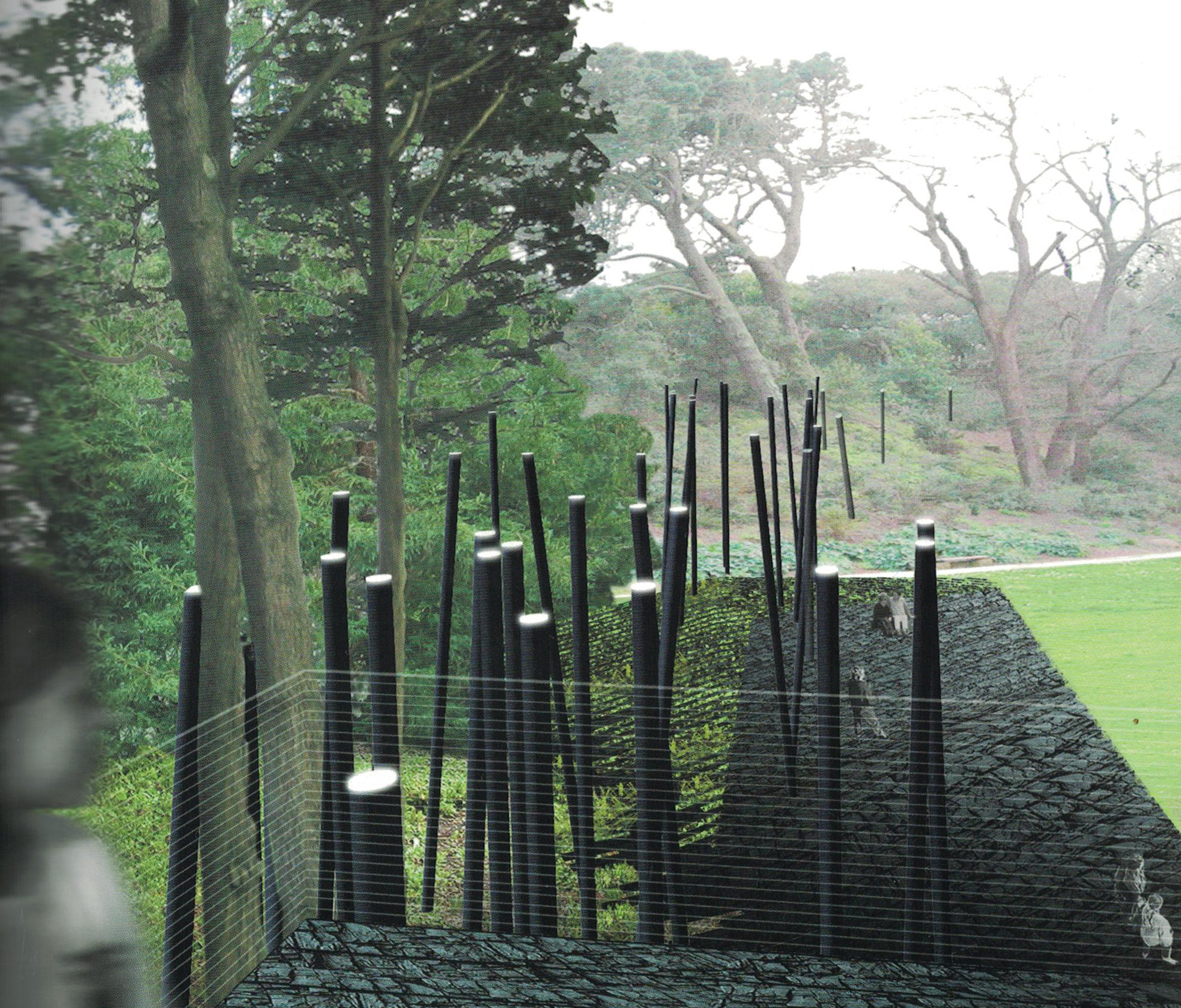 In 2005, the Grove’s governing board launched an international design competition styled “Emergent Memory: The National AIDS Memorial Competition.” The brief laid the issue bare: “For many supporters of the Grove, the need for a signature memorial element—a physical manifestation of the status designated by Congress that would broaden the Grove’s power to address the national and global impact of AIDS—came to the fore.”22 The competition drew some two hundred proposals. A jury of artists, curators, and architects (Sunil Gupta, Walter Hood, Mary Miss, Toshiko Mori, and Joseph Rosa) picked a winning entry titled Living Memorial: a “charred-wood viewing deck, a stand of black fiber rods with mirrored tips evocative of burnt trees, and a charred walkway where new plants would grow,” designed by Janette Kim and Chloe Town.23 This winning proposal was abandoned after a vocal public outcry labeled the design intrusive. The outfall from the failed competition fractured the governing board.24
