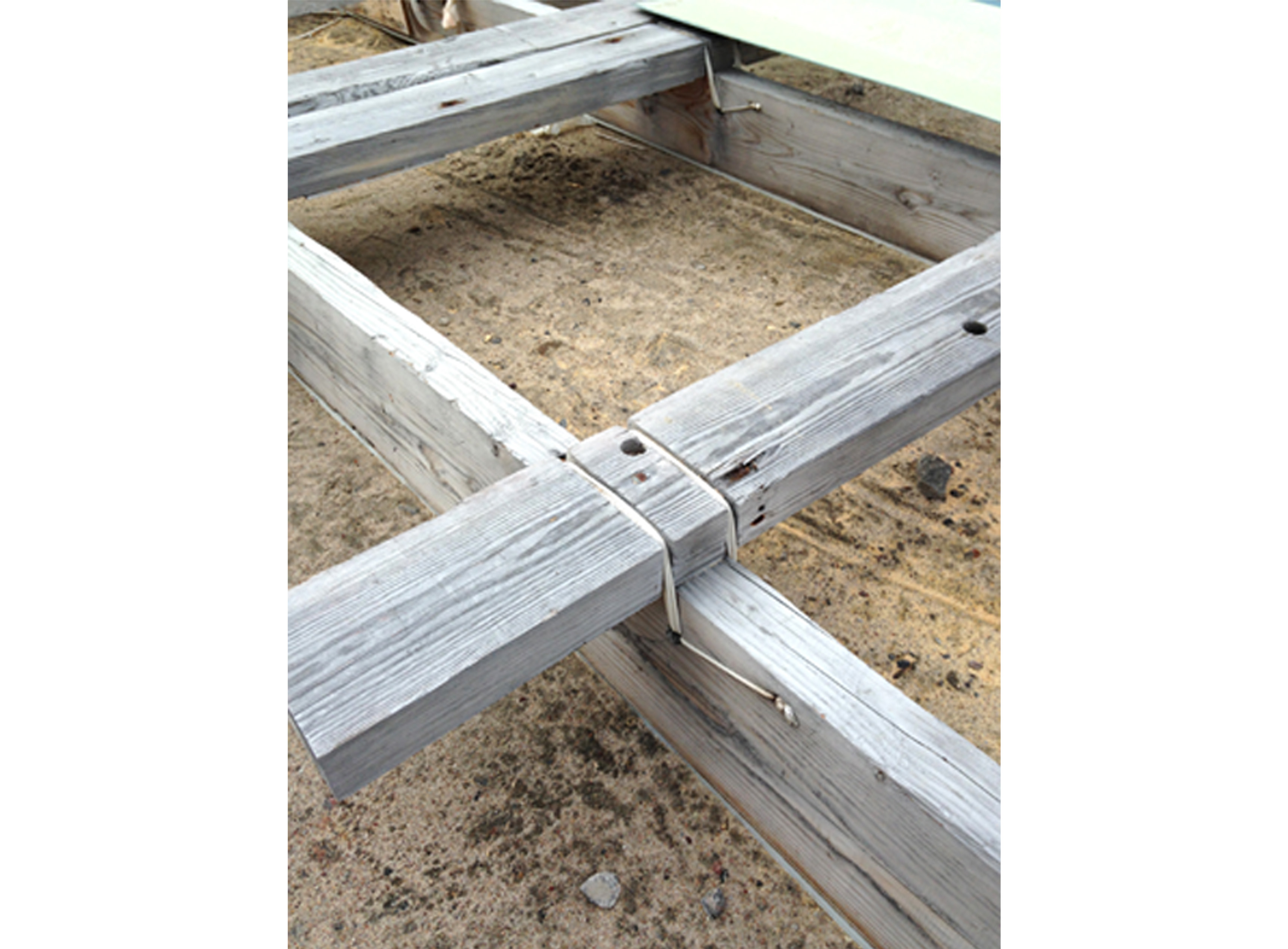 An array of strategies has been developed to prevent the ground’s thawing, from insulation under the slab to thermosyphons.44 Thermosyphons are passive cooling devices that, employing pressured heat exchange, draw out the heat from below the building.45 Commonly, steel piles are driven into the permafrost to support buildings, drilled at least two times deeper than the active layer’s thickness.46 Piles move by creeping (moving down) or frost-jacking (moving up) as permafrost warms or as the active layer gets thicker.47 A less costly alternative is the use of adjustable screw jacks, sitting 2 feet above the ground on wooden planks or a thick gravel pad, preventing the building’s heat from descending into the soil. The space under the house allows the wind to dry excesses of water and disperse the snow to avoid accumulation, which would naturally insulate the soil.48 The screw jacks can technically be adjusted to level the house, distributing stress on the structure. However, in practice they are not always adjusted when the appropriate equipment is absent. The foundations made by the Kangiqtugaapingmiut for their cabins, workshops, and sheds—also called “wood cribs”—generally consist of a stack of wood, parts of which are added as needed to level up the cabin. They are effective because residents can regularly adjust the foundations with simple tools. Buildings tend to be close to the ground, proximate to but not quite kissing the topography of the site. Some foundations are even made like qamutiik: attached with ropes.49 They do not require hardware and can be disassembled and reused. They are therefore flexible and adapt better to the ground’s fluctuating conditions.