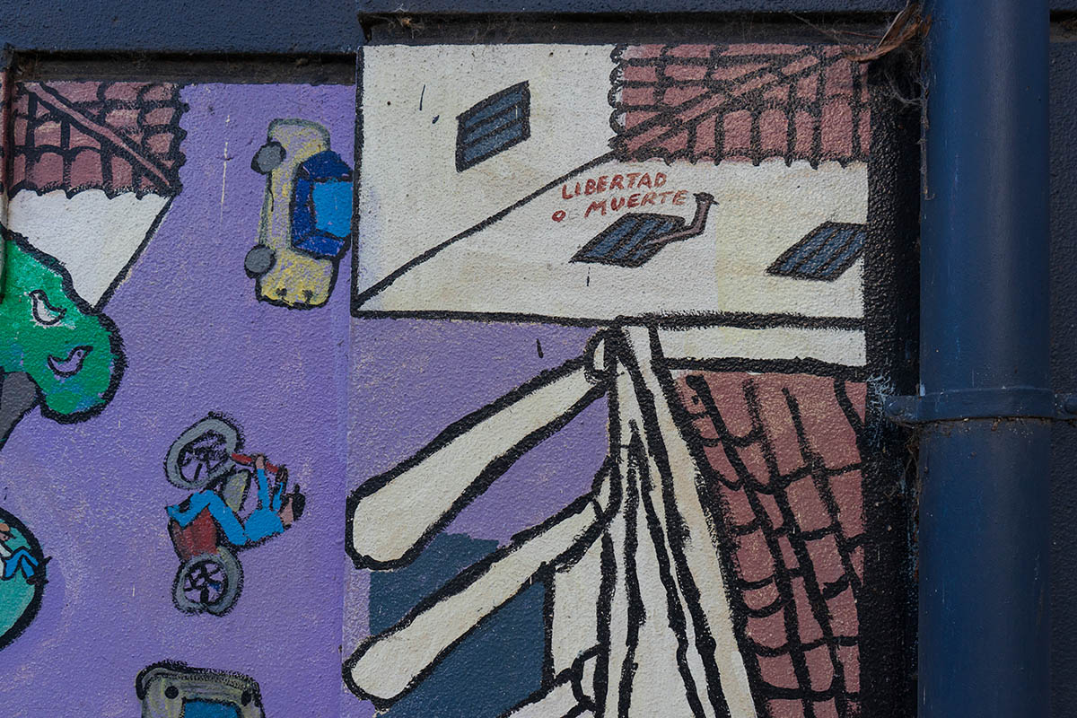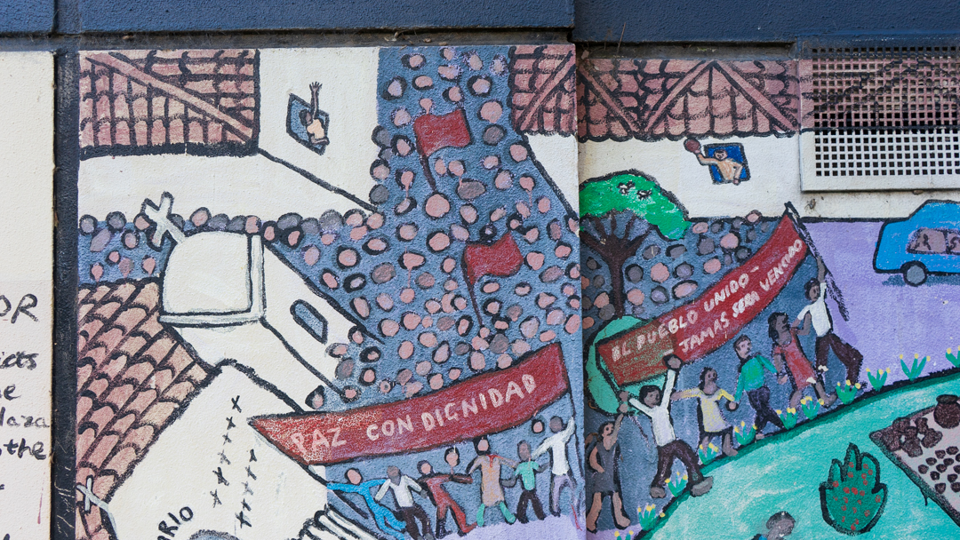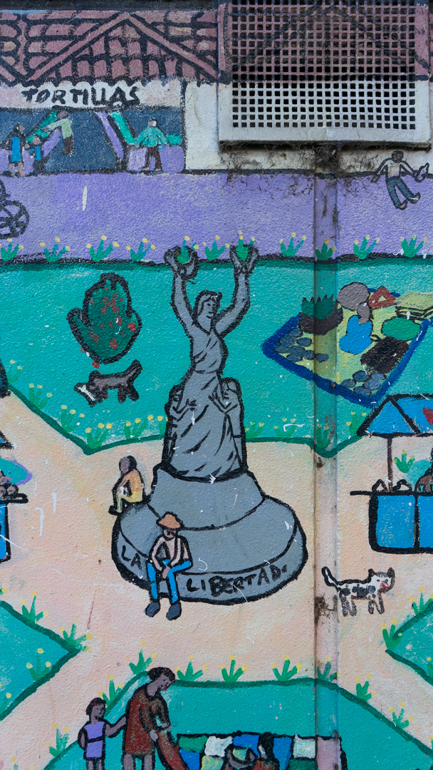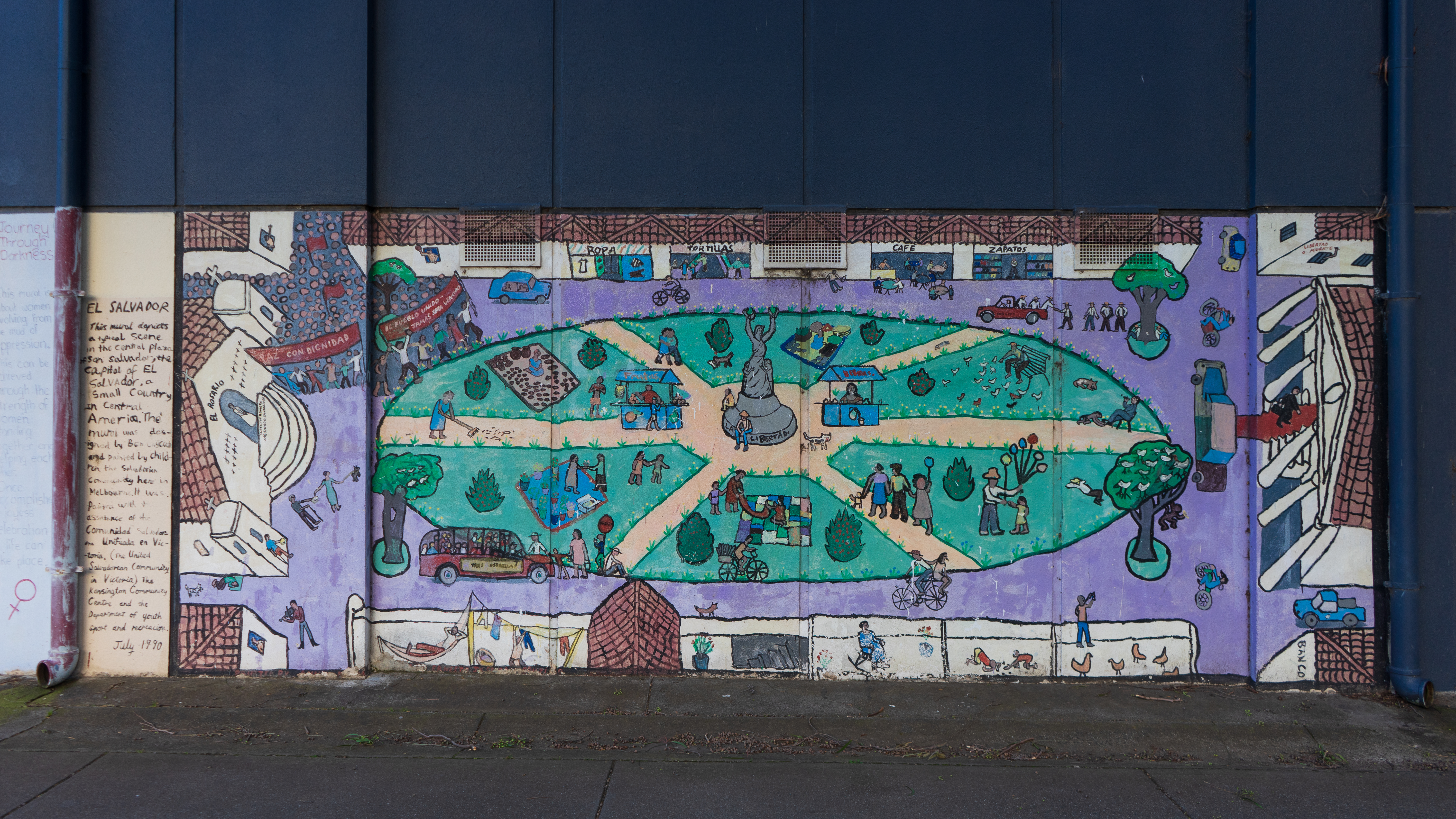 A Salvadoran community mural is set to be destroyed by the City of Melbourne Council as part of a $10.2 million “redevelopment” scheme in the gentrifying neighborhood of Kensington.1 Kensington, today, is a place where you can purchase ethically sourced Salvadoran single-origin coffee at a local café, and also a suburb demolishing one of the only public representations of the displaced Salvadoran community in Australia.2 The mural was painted on the exterior wall of the Kensington Community Recreation Center by artist Ben Laycock and a group of young Salvadorans from the housing flats across the road in 1990. It was a project of the Comunidad Salvadoreña Unificada en Australia (the United Salvadoran Community in Australia); the Kensington Community Center; and the Department of Youth, Sport, and Recreation. The mural depicts the Parque Libertad (Liberty Park) in San Salvador, the capital of El Salvador. A monument to justice sits at the center, a statue of the “angel of freedom,” who holds up two laurel wreaths at equal height to commemorate the primer grito de independencia (said to be the first cry for independence from the Spanish empire in Central America).3 There are families picnicking around it, people riding bicycles, a child aiming an ondia toward birds in a tree, a woman selling bebidas, a Don in a sombrero selling balloons, a man sitting on a bench feeding birds, an abuelita on a rocking chair, children playing marbles, aguacateros (street dogs) roaming the streets, and even a violin serenata. The park is surrounded by cafés and shoe and tortilla shops. In the top left, people are protesting arm-in-arm, holding banners that read “el pueblo unido jamás sera vencido/the people united shall never be defeated” and “paz y dignidad/peace and dignity.” Further down sits the church of El Rosario, which, as a site of refuge for early community organizers, draws attention to the role of liberation theology.4 At the church’s entrance stands the recently canonized Archbishop of El Salvador, Óscar Romero, who was assassinated in 1980 during mass. In the top right, a political prisoner raises their fist through the bars of a cell, saying “libertad o muerte/liberty or death.” Below him a suited bureaucrat exits a limo and enters the Palacio Nacional.