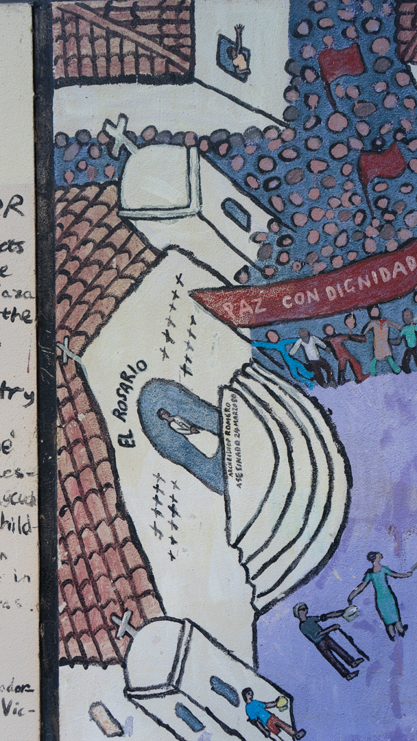 The church was a key site for workers, unions, students, and the political left. In the 1979 massacre, protesters found refuge in the church. The dent of the bullet caps can still be seen on the outside of the church where the military opened fire on them. There are twenty-one bodies buried in the church, including from these initial uprisings. See Jessica Orellana, “Conoce la historia de los 21 cuerpos enterrados en la iglesia El Rosario,” elsalvador.com, May 22, 2021, link. ↩