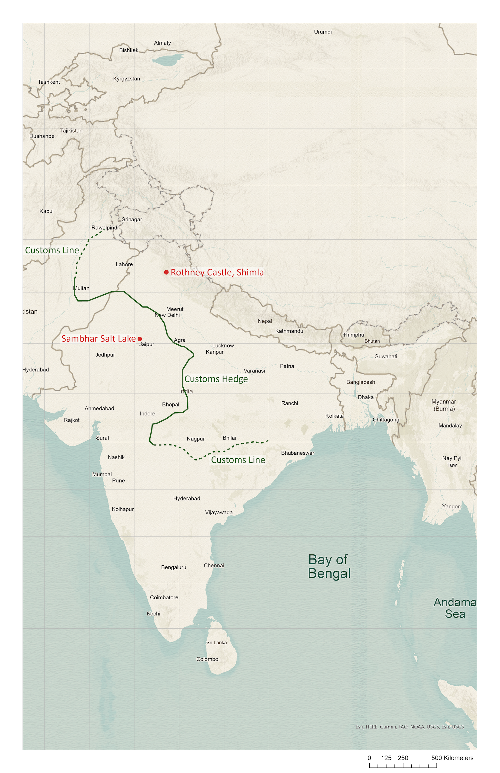 To secure the levy of a duty on salt… there grew up gradually a monstrous system, to which it would be almost impossible to find a parallel in any tolerably civilized country. A Customs line was established which stretched across the whole of India, which in 1869 extended from the Indus to the Mahanadi in Madras, a distance of 2,300 miles; and it was guarded by nearly 12,000 men… It would have stretched from London to Constantinople… It consisted principally of an immense impenetrable hedge of thorny trees and bushes.2