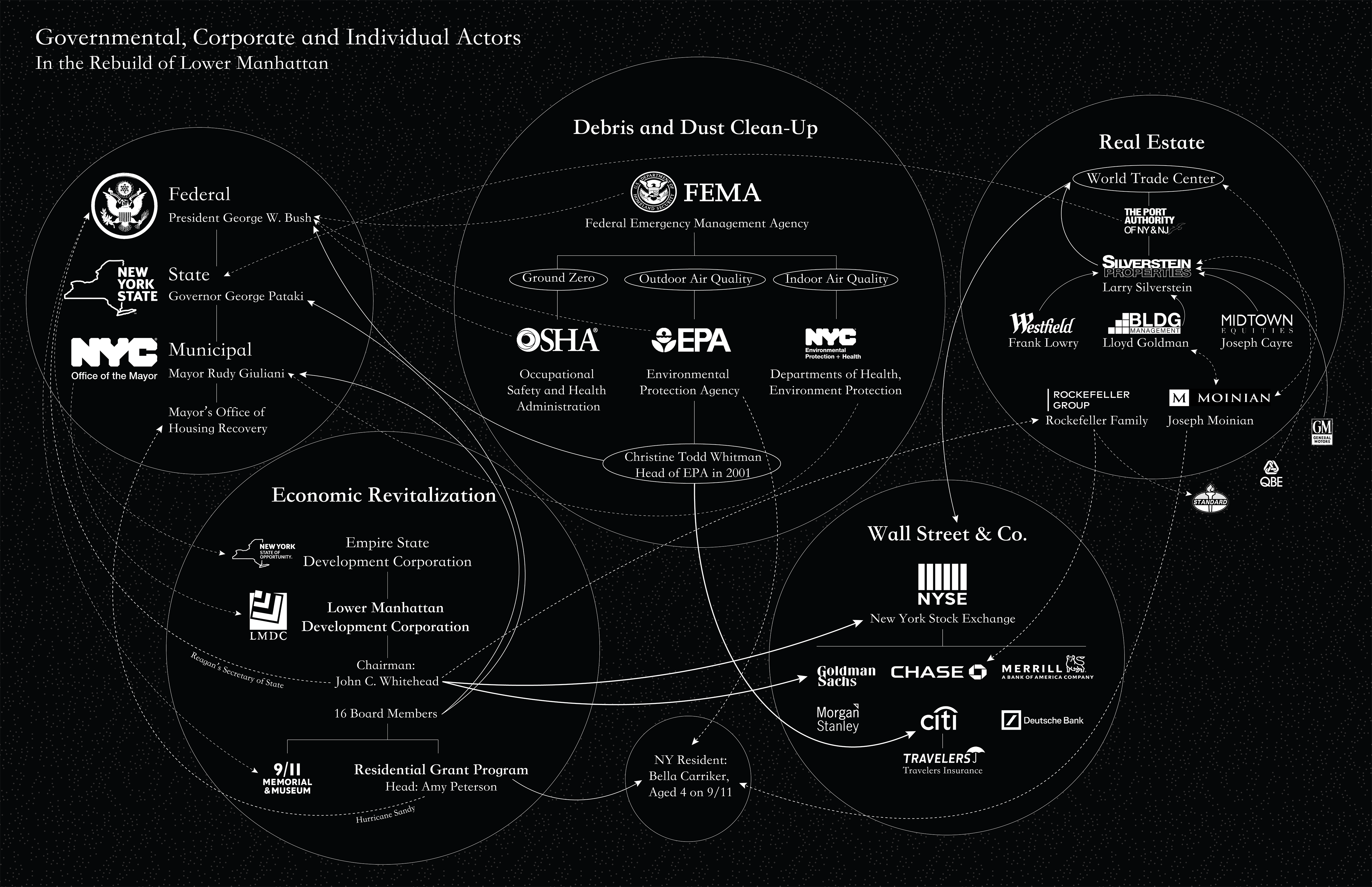 Indeed, almost all government actors involved in reconstruction efforts at the time possessed some connection to Wall Street or big banks, and thus had an incentive to prioritize these financial institutions over human life. On the side of economic revitalization efforts, the LMDC was created by the Empire State Development Corporation, a state-level organization with the power to “issue bonds and notes, grant loans and tax exemptions, acquire private property, exercise eminent domain, create subsidiaries, and override local laws, ordinances, codes, charters or regulations (e.g., zoning), bypassing the NY’s state constitution limits.”30 Thus, traditional channels of approval and regulation could be easily circumvented for the sake of overall economic growth. The newly appointed head of the LMDC, John C. Whitehead, had previously been a partner at and chairman of Goldman Sachs, as well as a director of the New York Stock Exchange.31 Whitehead also had a long association with the Rockefeller family, overseeing the Rockefeller Group’s investments (including real estate), and had previously worked as Deputy Secretary of State in the Reagan administration.32 Since the mid-2000s, the motives and relevance of the LMDC have remained at times unclear to residents, with City Council member Julie Menin (then member of Manhattan Community Board 1) stating in 2006, “We’ve always questioned the wisdom of having the LMDC involved in that project, given that they have no background in environmental issues.”33 In fact, publicly available LMDC meeting notes from 2002 indicate Whitehead’s enthusiasm for supposed “positive developments… including the return of 8500 Merrill Lynch employees to the area… the opening of the West Side Highway and the return of 400 workers from the Bank of Nova Scotia to the area.”34 Whitehead’s comments reveal an overt focus on the financial sector’s return to normalcy, with no mention of supporting other residents impacted in the attacks. Much of the discussion around rebuilding and economic revitalization at this time revolved around Wall Street and the reopening of banks as the primary priority.