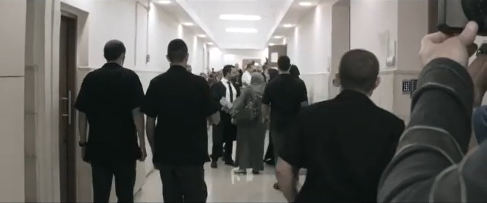 Waiting impatiently by the elevator bank before the trial and by the courtroom doors after, a hive of media photograph Ahmad and Israa. As a general spatial condition that fragments circulation, elevators chop up vertical continuity between spaces, spitting out its occupants abruptly onto a new floor. This spatial condition, nearly ubiquitous to large public buildings, becomes ripe for photographers to exploit as a site of courtroom spectacle. The elevator doors open, leaving each defendant stunned, with little time to cover their faces. The corridors connecting the elevator to the courtroom stage another long photographable moment. After the court has adjourned, Ahmad and Israa must each walk back to the elevator. In this egress they process and discuss the news they just received inside the chamber, which gives the media ample time to watch and photograph them.