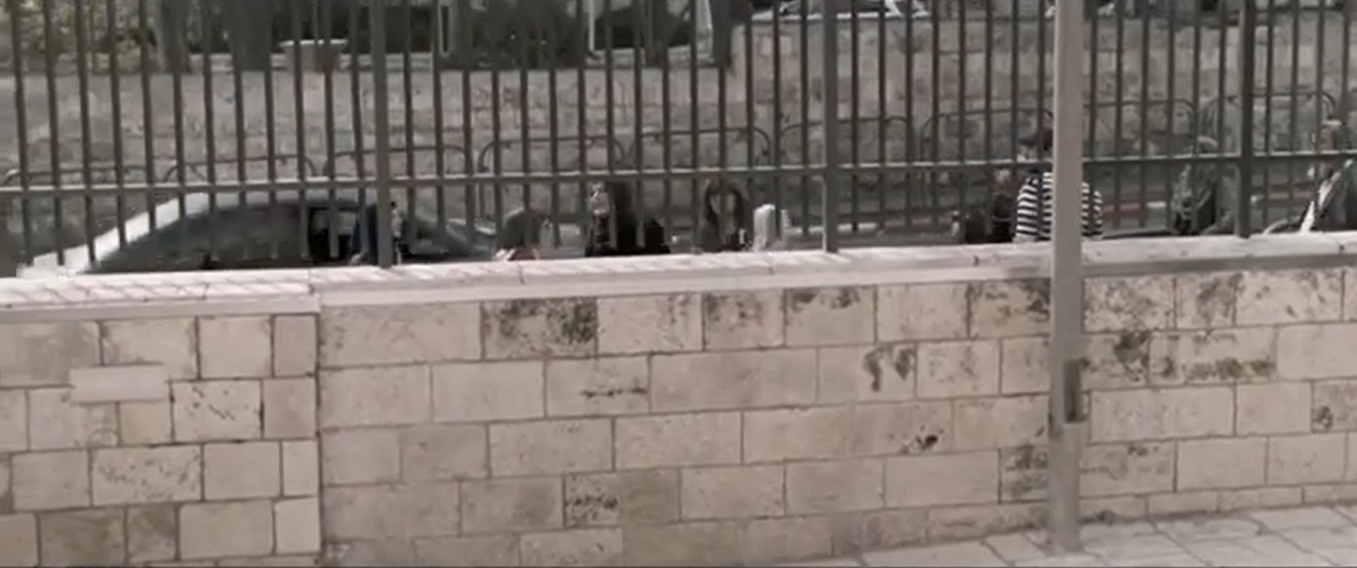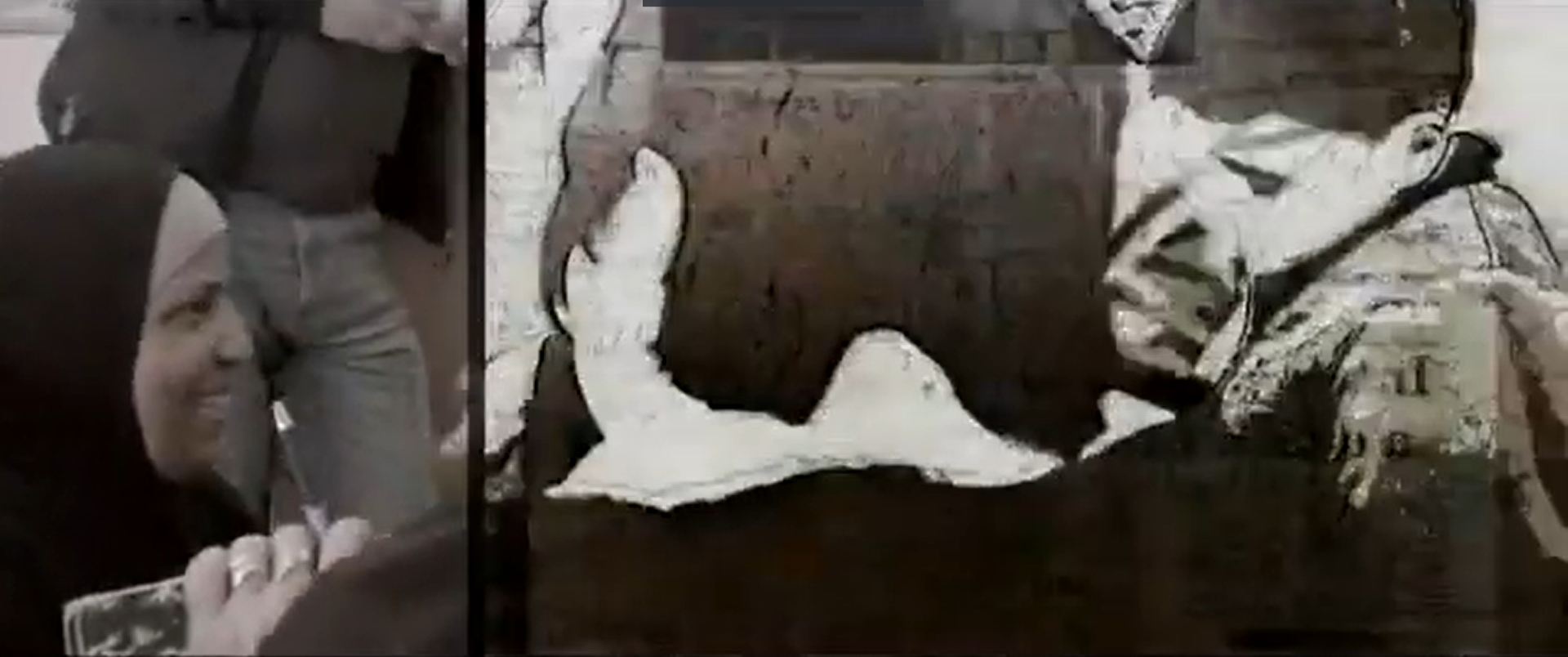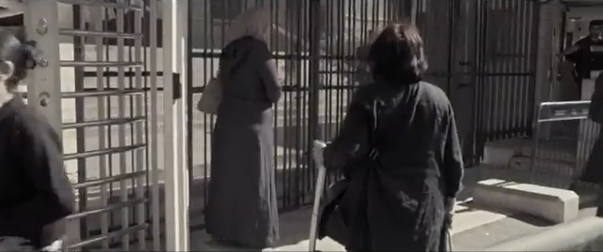 The restriction of information is not limited to Ahmad’s parents. Tsemel and Israa cross paths when the defender walks from the elevator to the courtroom to join her defendant, who is already leaving the courtroom to go back to the elevator. The court’s procedures are slyly rushed to exclude Tsemel herself from critical information. Here in the hallway, Israa’s family receives news of her eleven-year sentence. While the camera does not keep filming past Ahmad’s verdict, it does after Israa’s is delivered. Unaware that sentencing began and ended so quickly, Tsemel immediately tries to get into the courtroom for answers, and Israa’s family follows. Later, as her sister and father cry in the hallway, their grief and anger erupt outside along the sidewalk as the family rails at the state. Israa’s mother weeps uncontrollably, her cries heard as she passes behind a stone wall.