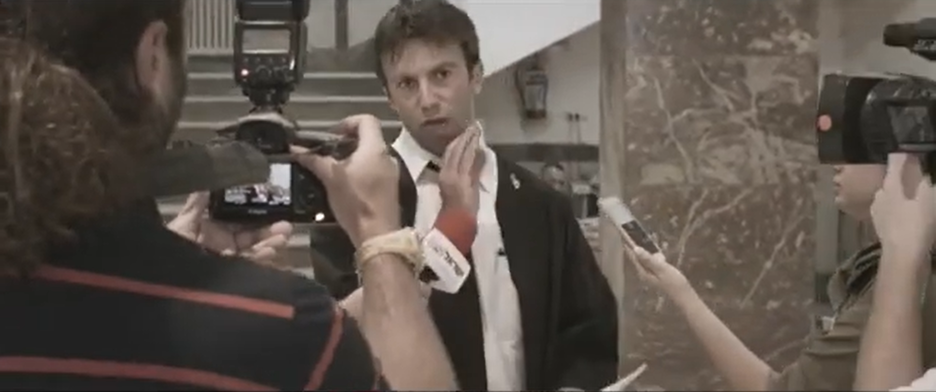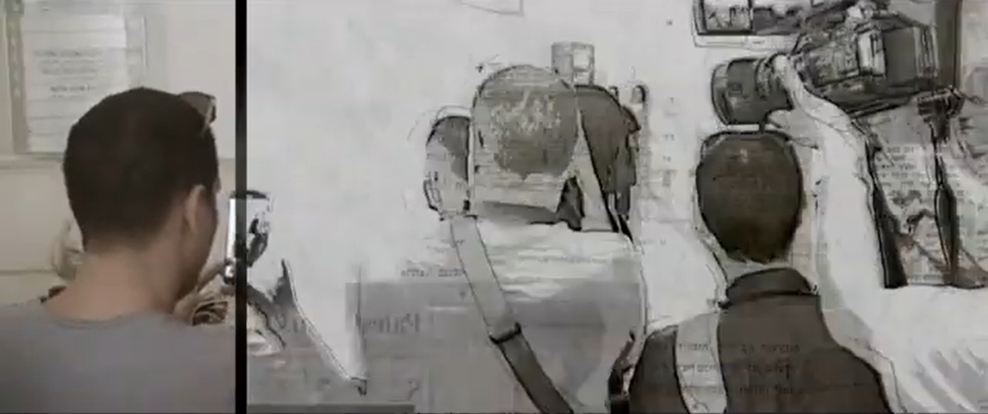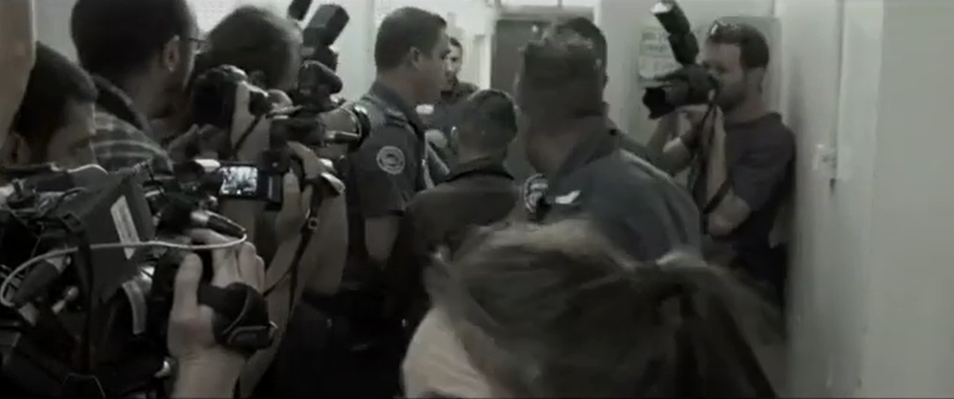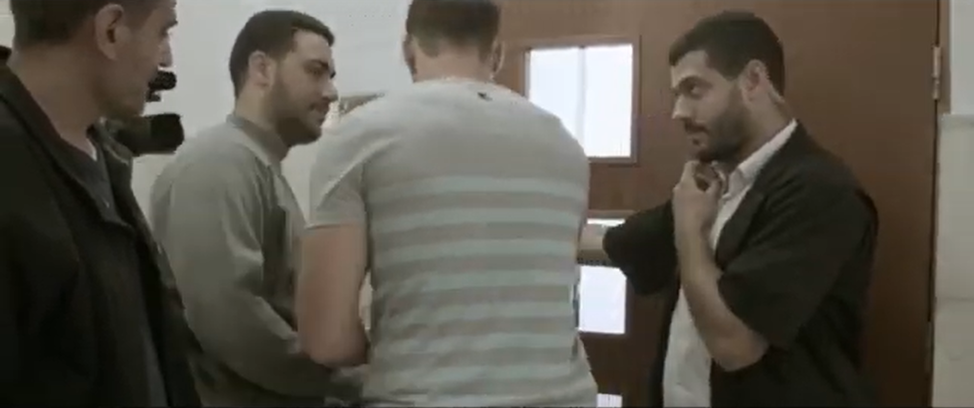 What enables Israeli court architecture to create these spectacles? For Ahmad and Israa, their spectacular fates differ.12 While the court is in session, the photographers review their images of Ahmad. The camera zooms in on their screens showing photos of what looks like Ahmad crying or, according to the photographer, smiling. These images are slippery and open to interpretation. After the court session, a new space emerges: the lobby. As photographers reconstruct Ahmad’s media character from photos, it is now the prosecutor who reports on Ahmad and the trial verbally. In the lobby, the photographers do not have to hunt for material, but instead have it delivered via interview. In front of cameras and microphones, the prosecutor labels Ahmad a “terrorist” for the reporters to circulate in the world outside. Perhaps because it is most accessible to the public, the lobby lends itself to planned theatrical situations. It becomes a crucial mediator of realities, narratives, and testimonies, where the media and prosecutors are able to construct and project their own version of the truth, one that affirms Israeli state power and demonizes Palestinian defendants. It is no coincidence that this space is revealed to the viewer after having seen newsreels, meetings with Ahmad’s family in Tsemel’s office, and makeshift scenes in the courtroom corridors. As a documentary film, Advocate gives us the distance needed to see these larger architectural, media, and carceral systems working together.
