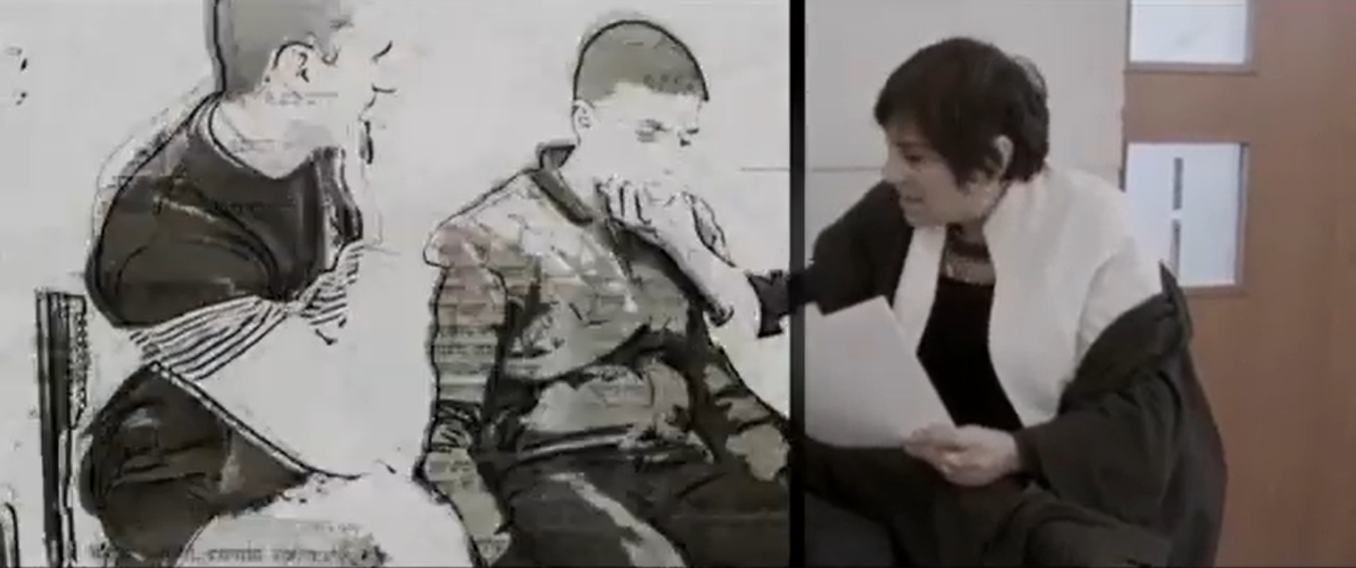 The hallway offers moments of respite in Advocate: sometimes, this linear corridor allows informal legal counsel to take place. While Tsemel can meet with Ahmad’s parents at her office to review plea negotiations, her time with Ahmad himself is confined to courtroom session breaks. Here in the hallway adjacent to the courtroom, Tsemel often finds a bench where she can speak with Ahmad alongside his father, giving him guidance on how to answer questions and, crucially, telling him what his testimony does for their case. However, the documentary shows how this respite space is makeshift and exposed. During Tsemel’s counseling, two Palestinian women interrupt her to start kissing Ahmad, praising him as a martyr and affirming to him that “all Palestinian mothers are mothers to [him].”13 Although this interruption contains support and sympathy, we see Tsemel get impatient; she is clearly frustrated with how little time she has with Ahmad, the lack of privacy, and the enormity of the task of getting a child to concentrate amid the chaos. Tsemel’s dependency on the hallway for private counsel demonstrates the degraded spatial conditions available to Palestinians within the Israeli legal system.