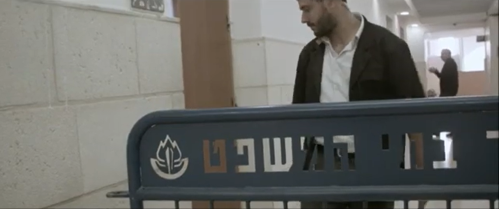 If the gate and turnstile, along with the tacitly approved Israeli guard and defender, are a buffer at the building’s entrance, then the extra space outside the courtroom also assumes a certain regulatory function. Here, too, buildings and bodies work together to control movement. The frame is now limited to a security guard and a single metal barricade, which the guard repositions by hand. As Lea Tsemel enters the courtroom, the door is held open for her and then shut on her Palestinian staff, who must show ID to prove they belong with Tsemel. What marks this threshold as different from the exterior checkpoints is the speed at which security can stiffen or relax based on the heavily perceived identities of each body crossing it. The inner courtroom is not only insulating the judicial process but also filtering Palestinian access as tightly as possible. The redundancy of exclusion goes even further when we observe that Ahmad’s parents are allowed into the courthouse but denied entry into the courtroom proper. Importantly, the documentary cameras continue to film outside even after the security guard blocks their entry. The parents are filmed leaning against the walls in the hallway, checking voicemails and scrolling on their phones: daily banal acts that constitute another, less spectacular, layer of the occupation.