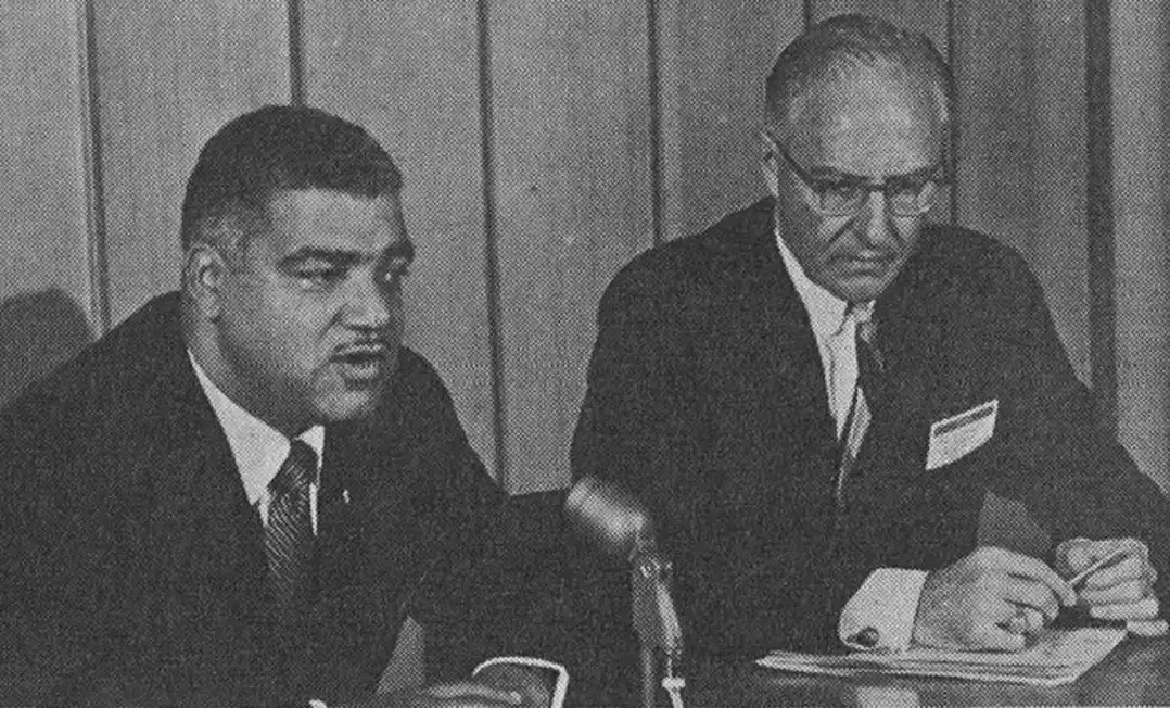 Civil Rights leader Whitney Moore Young Jr. during the press conference at the 1968 AIA Convention. Courtesy of The American Institute of Architects Archives, Washington, DC.
